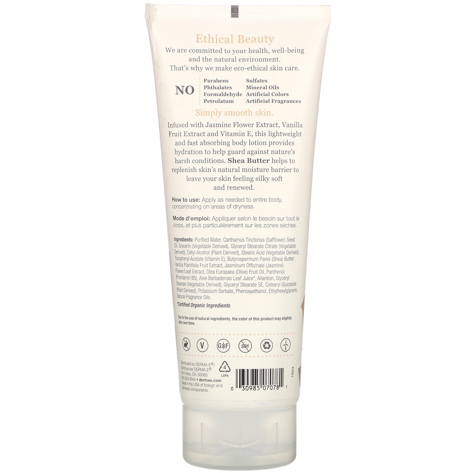 100% Vegan Soy-Free Eco-Ethical Cruelty-Free Vegan Gluten Free Ethical Beauty We are committed to your health, well-being, and the natural environment. That’s why we make eco-ethical skin care. No Parabens No Phthalates No Formaldehyde No Petrolatum No Sulfates No Mineral Oils No Artificial Colors No Artificial Fragrance Simply Smooth Skin. Infused with Jasmine Flower Extract, Vanilla Fruit Extract and Vitamin E, this lightweight and fast absorbing body lotion provides hydration to help guard against nature's harsh conditions. Shea Butter helps to replenish skin's natural moisture barrier to leave your skin feeling silky soft and renewed.Sugg. UseApply as needed to entire body, concentrating on areas of dryness.Other IngredientsPurified water, carthamus tinctorius (safflower) seed oil, glycerin (vegetable derived), glyceryl stearate citrate (vegetable derived), cetyl alcohol (plant derived), stearic acid (vegetable derived), tocopheryl acetate (vitamin e), butyrospermum parkii (shea) butter, vanilla planifolia fruit extract, jasminum officinale (jasmine) flower/leaf extract, olea europaea (olive) fruit...