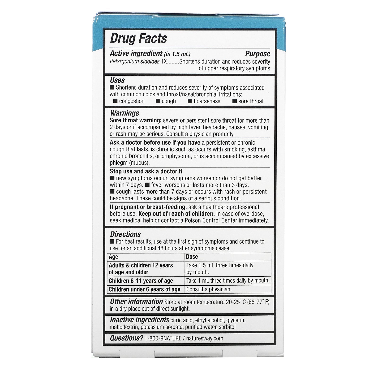 Drug Facts Active Ingredient (in 1.5 ml) Purpose Pelargonium sidoides 1X Shortens duration and reduces severity of upper respiratory symptoms Inactive ingredients : Citric acid, ethyl alcohol, glycerin, maltodextrin, potassium sorbate, purified water, sorbitol.Supplement Facts