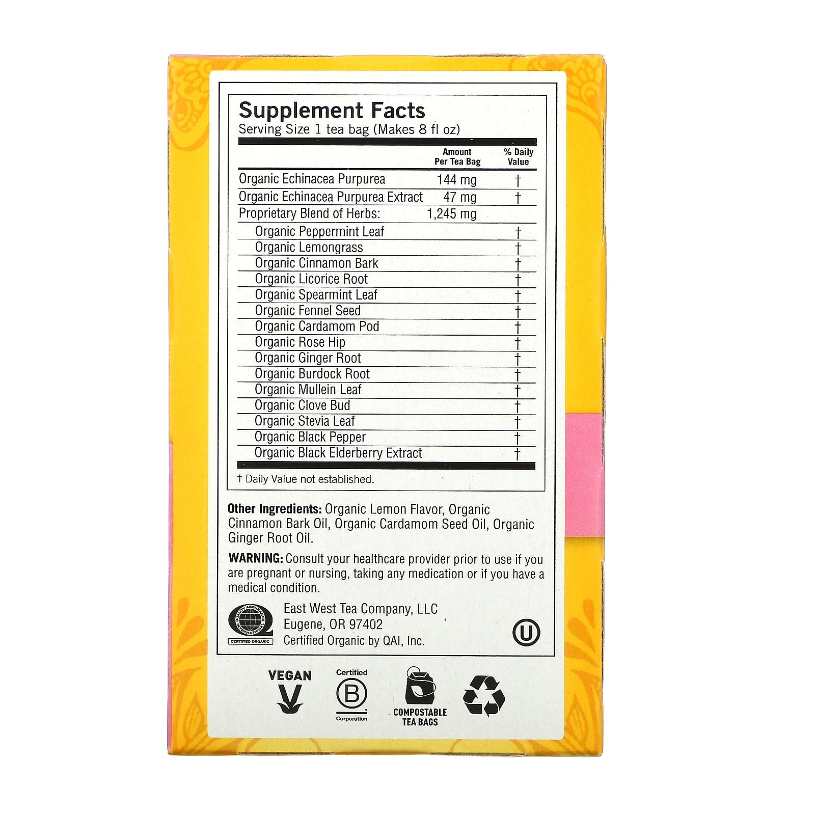 Supports Immune Function Caffeine Free Herbal Supplement Non-GMO Project Verified USDA Organic Vegan Certified B Corporation Compostable Tea Bags Kosher Certified Organic by QAI Non-Irradiated Ingredients Oxygen-Bleached Tea Bags Support Your Health with