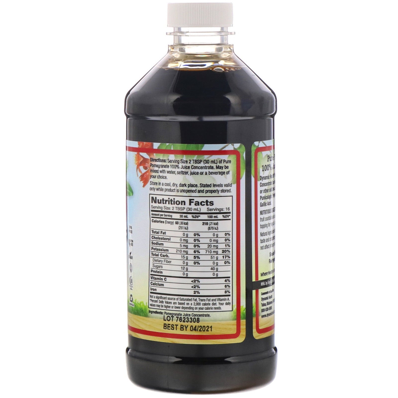 BPA Free Gluten Free Vegan Kosher Halal Where Health & Flavor Meet!Sugg. UseServing Size 2 Tbsp (30 ml) of Pure Pomegranate 100% Juice Concentrate. May be mixed with water, seltzer, juice or a beverage of your choice. Nutritious Suggestions: Ideal for tropical smoothies, fruit cocktails and as a mixer. A delicious, natural topping for yogurt, ice cream, fruit, pastry and dessert. Shake well before using. Refrigerate after opening.Other IngredientsPomegranate juice concentrate. Dynamic Health® Pure Pomegranate Juice Concentrate has not sweeteners, preservatives or other additives. Contains naturally occurring punicalagin, polyphenols, ellagic acid and gallic acid.Supplement FactsServing Size: 2 Tbsp (30 ml) Servings: 16 Amount per Serving 30 mL %DV* 100 mL %DV* Calories (Energy) 60 (.06 kcal) (251 kJ) 210 (.21 kcal) (879 kJ) Total Fat 0 g 0% 0 g 0% Cholesterol 0 mg 0% 0 mg 0% Sodium 5 mg 0% 20 mg 1% Potassium 210 mg 6% 710...