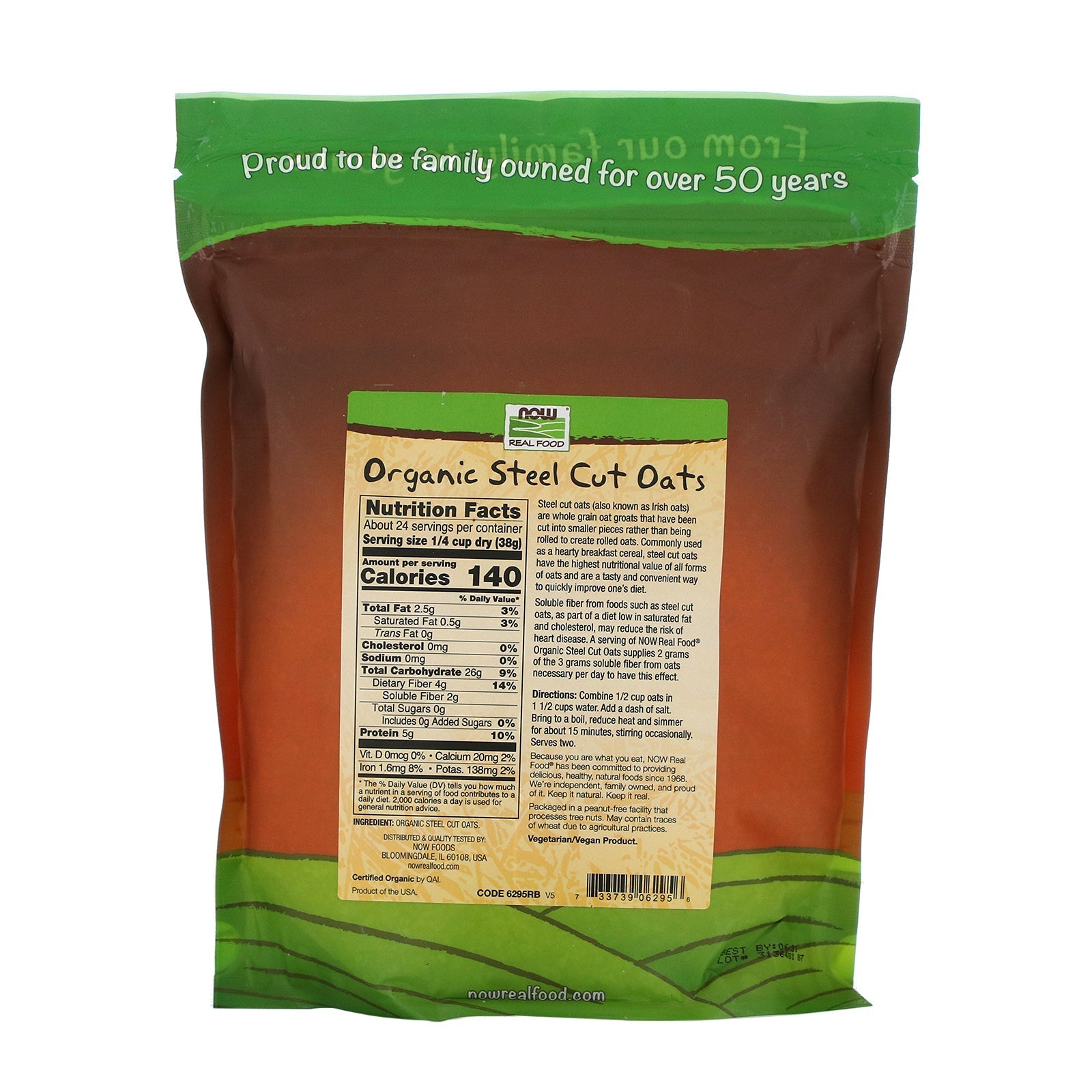 Real Food Good Source of Fiber 100% Whole Grain USDA Kosher Non GMO Project Verified Always Real Always Non-GMO Hearty, Nutritious & Wholesome Celebrating 50 Years of Natural Goodness Vegetarian/Vegan Product Steel Cut Oats Steel Cut Oats (also known as Irish Oats) are whole grain oat groats that have been cut into smaller pieces rather than being rolled to create rolled oats. Commonly used as a hearty breakfast cereal, steel cut oats have the highest nutritional value of all forms of oats and are a tasty and convenient way to quickly improve one's diet. Soluble fiber from foods such as steel cut oats, as part of a diet low in saturated fat and cholesterol, may reduce the risk of heart disease. A serving of NOW Real Food Steel Cut Oats supplies 2 gram of the 3 grams soluble fiber from oats necessary per day to have this effect. Because you are what you eat, Now Real Food has been committed to providing delicious, healthy, natural foods since 1968. We're independent, family owned, and proud of it. Keep it natural. Keep it real.