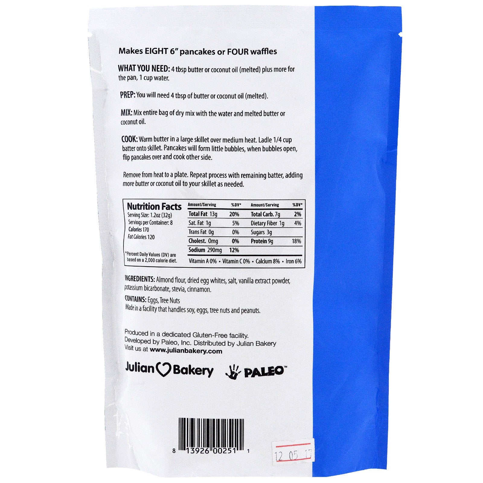 9 g Protein | 6 g Net Carbs |170 Calories Per Serving Grain-Free & Gluten Free Makes Eight 6” Pancakes or Four Waffles Produces in a Dedicated Gluten-Free Facility PaleoSugg. UseWhat You Need: 4 tbsp butter or coconut oil (melted) plus more for the pan, 1 cup of water. Mix: Mix entire bag of dry mix with the water and melted butter or coconut oil. Cook: Warm butter in a large skillet over medium heat. Ladle 1/4 cup batter onto skillet. Pancakes will form little bubbles, when bubbles open, flip pancakes over and cook other side. Remove from heat to a plate. Repeat process with remaining batter, adding more butter or coconut oil to your skillet as needed.Other IngredientsAlmond flour, dried egg whites, salt, vanilla extract powder, potassium bicarbonate, stevia, cinnamon Contains: Eggs, tree nuts Made in a facility that handles soy, eggs, tree nuts and peanuts.Supplement FactsServing Size: 1.2...