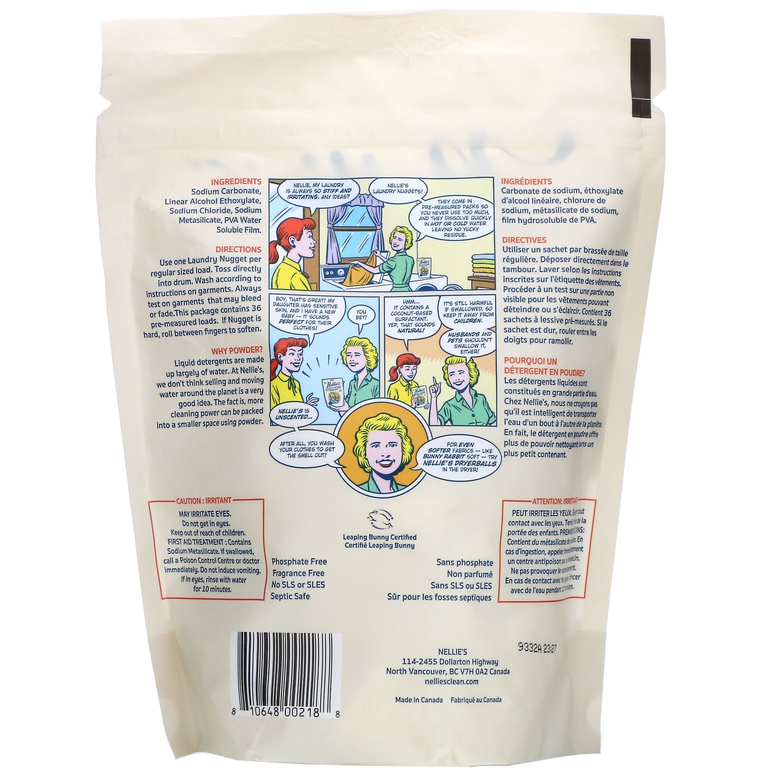 H•e 36 Loads Phosphate Free Fragrance Free No SLS or SLES Septic Safe Leaping Bunny Certified Why Powder? Liquid detergents are made up largely of water. At Nellie's we don't think selling and moving water around the planet is a very good idea. The fact is, more cleaning power can be backed into a smaller space using powder.Sugg. UseUse one laundry nugget per regular sized load. Toss directly into drum. Wash according to instructions on garments. Always test on garments that may bleed or fade. This package contains 36 pre-measured loads. If nugget is hard, roll between fingers to soften.Other IngredientsSodium carbonate, linear alcohol ethoxylate, sodium chloride, sodium metasilicate, pva water soluble film.Supplement FactsDisclaimerWhile VitaminsUK strives to ensure the accuracy of its product images and information, some manufacturing changes to packaging and/or ingredients may be pending update on our site. Although items may occasionally ship with alternate packaging, freshness is...