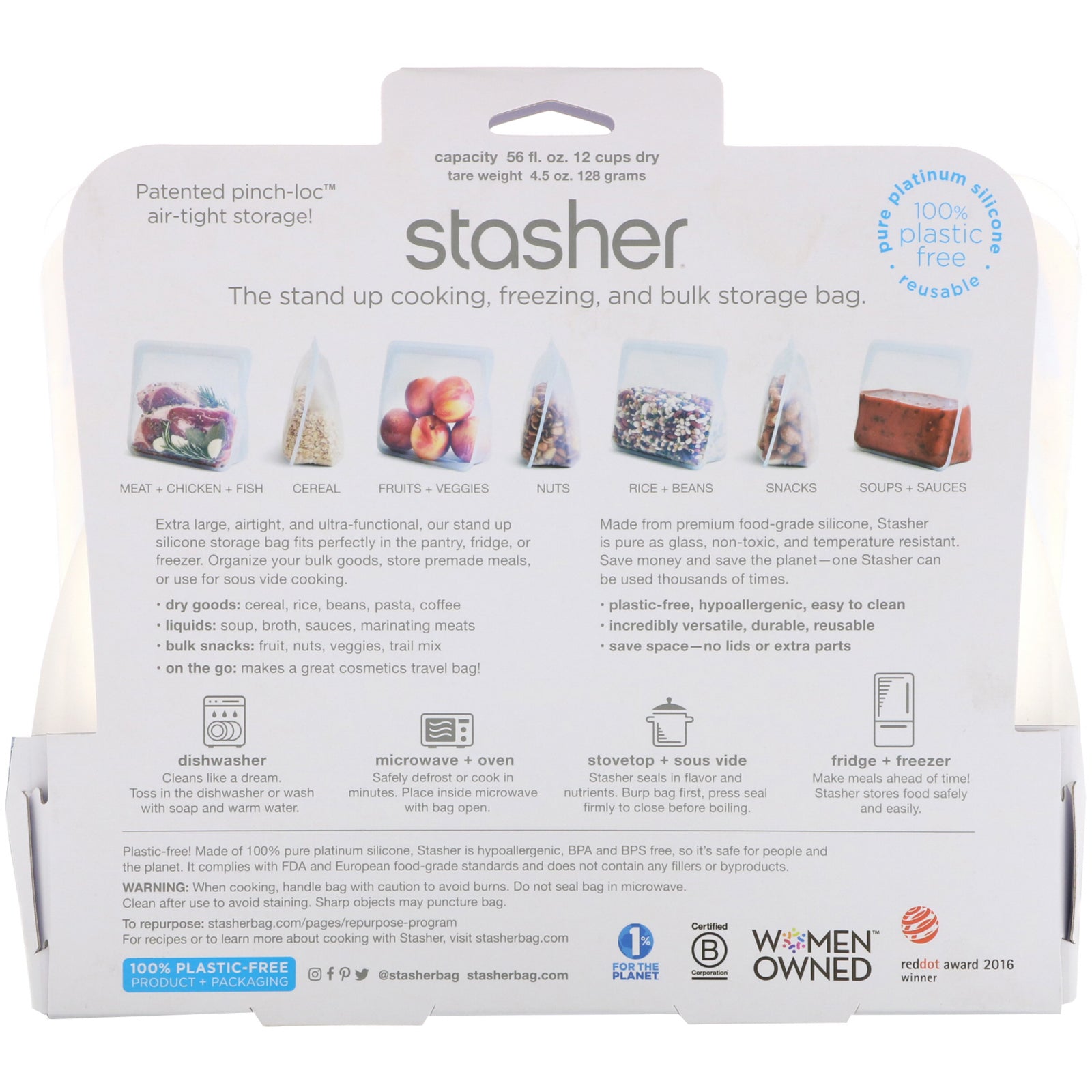 Pure Platinum Silicon Reusable 100% Plastic Free The Plastic-Free Reusable Storage Bag You Can Cook in Certified B Corporation Patented Pinch-Loc Air-Tight Storage! Capacity 56 fl. oz 12 Cups Dry Tare Weight 4.5 oz. 128 Grams Reddot Award 2016 Winner Good For Bulk Dry Storage Store It Freeze It Cook It The stand-up cooking, freezing, and bulking storage bag. Meat + Chicken + Fish Cereal Fruits + Veggies Nuts Rice + Beans Snacks Soups + Sauces Extra-large, airtight, and ultra-functional, our stand up silicon storage bag fits perfectly in the pantry, fridge, or freezer. Organized your bulk goods, store premade meals, or use for sous vide cooking. Dry goods: Cereal, rice, beans, pasta, coffee Liquids: Soup, broth, sauces, marinating meats Bulk snacks: fruit, nuts, veggies, trail mix On the go: Makes a great cosmetics travel bag! Made from premium food-grade silicon, Stasher is pure as glass, non-toxic, and temperature resistant....