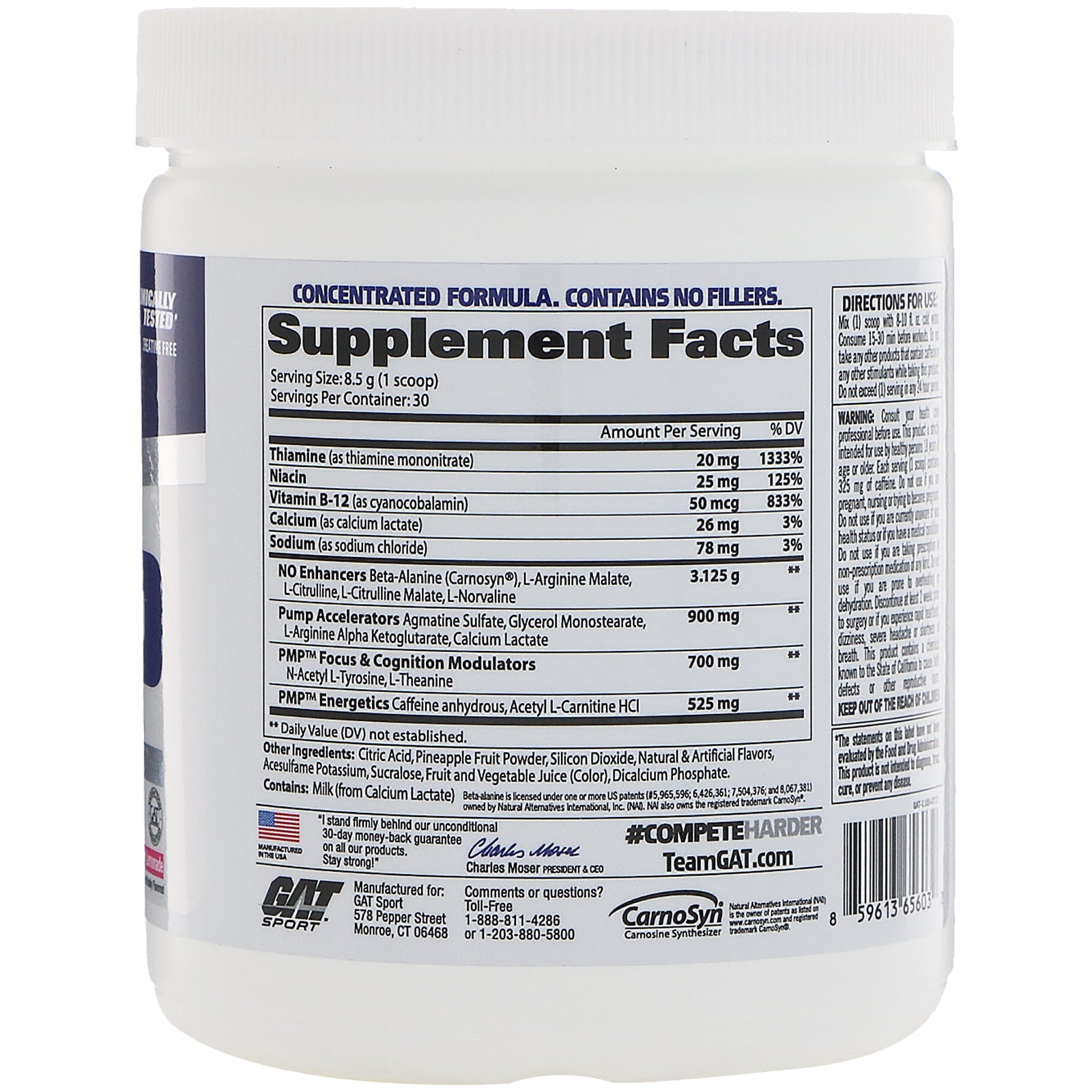 Clinically Tested Creatine Free Intense Performance Gains & Mental Focus Muscle Energy & Rapid Vascular Muscle Pumps 30 Servings Dietary Supplement Naturally and Artificially Flavored Concentrated Formula. Contains No Fillers. #CompeteHarder CarnoSyn PMP: Peak Muscle Performance PMP by GAT delivers the next generation of intense pre-workouts. Blast through training plateaus and take your sports endurance and muscular output to the next level. Experience more massive pumps, laser-focus, and workout intensity. A powerful blend of clinically researched key ingredients formulated to deliver the ultimate in Peak Muscle Performance. Multi-Wave Delivery Wave 1: You will feel PMP's strong, stimulating action. It ignites a high intensity workout and delivers critical performance nutrients to your muscles. Wave 2: Increased concentration and razor sharp focus will hit you, helping your mind and body work in tandem for perfect execution of each and every action of your workout. Wave 3: As your workout intensifies, your muscles will expand from increased blood volume and you will feel skin tightening effects that keep your body fired up even after your workout ends. Experience explosive energy and improved performance. Exercise Intensity: Citrulline, Citrulline Malate and Beta Alanine (CarnoSyn) push your training to the max. The key compounds in PMP have been clinically researched for their benefits to athletic performance via increased blood flow, enhanced nutrient delivery, and improved muscular energy and endurance. Cognitive Enhancers: Clinically studied compounds N-Acetyl-Tyrosine and L-Theanine help you remain alert, intense, and mentally focused while you're going from set to set during your workout. Pump Drivers: Clinically studied, vasodilating compounds Agmatine Sulfate, Glycerol Monostearate, and Calcium Lactate.