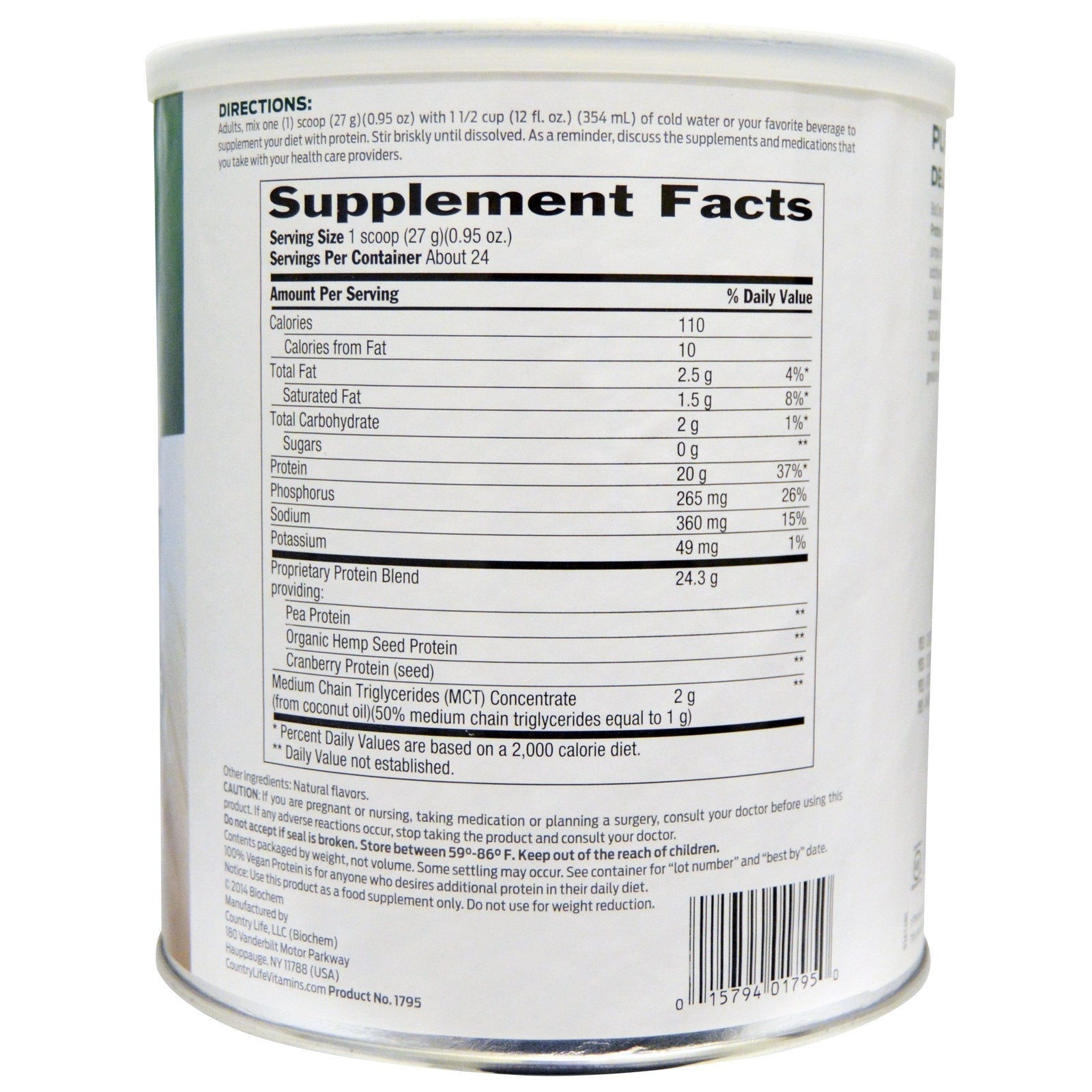 Serving Size: 1 scoop (27 g) (0.95 oz.) Serving Per Container: About 24 Amount Per Serving %Daily Value Calories 110 Calories from Fat 10 Total Fat 2.5 g 4%* Saturated Fat 1.5 g 8%* Total Carbohydrate 2 g 1%* Sugars 0 g ** Protein 20 g 37%* Phosphorus 265 mg 26% Sodium 360 mg 15% Potassium 49 mg 1% Proprietary Protein Blend providing: 24.3 g Pea Protein ** Organic Hemp Seed Protein ** Cranberry Protein (seed) ** Medium Chain Triglycerides (MCT) Concentrate (from coconut oil) (50% medium chain triglycerides equal to 1 g) 2 g ** * Percent Daily Values are based on a 2,000 calorie diet. ** Daily Value not established.Disclaimer