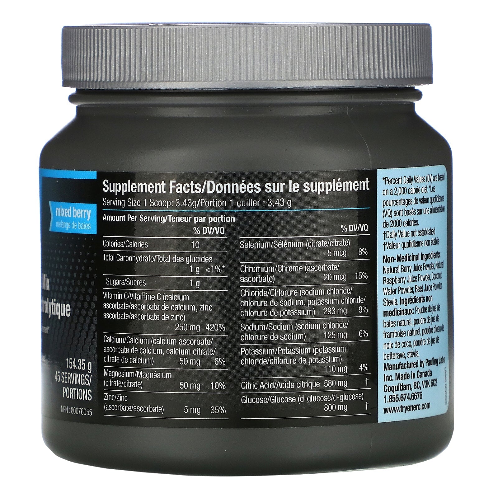 Serving Size: 1 Scoop (3.43 g) Amount Per Serving %Daily Value Calories 10 Total Carbohydrate 1 g <1%* Sugars 1 g Vitamin C (calcium ascorbate, zinc ascorbate) 250 mg 420% Calcium (calcium ascorbate/calcium citrate) 50 mg 6% Magnesium (citrate) 50 mg 10% Zinc (ascorbate) 5 mg 35% Selenium (citrate) 5 mcg 8% Chromium (ascorbate) 20 mcg 15% Chloride (sodium chloride, potassium chloride) 293 mg 9% Sodium (sodium chloride) 125 mg 6% Potassium (potassium chloride) 110 mg 4% Citric  Acid 580 mg † Glucose (d-glucose) 800 mg † *Percent Daily Values (DV) are based on a 2,000 calorie diet. †Daily Value not established