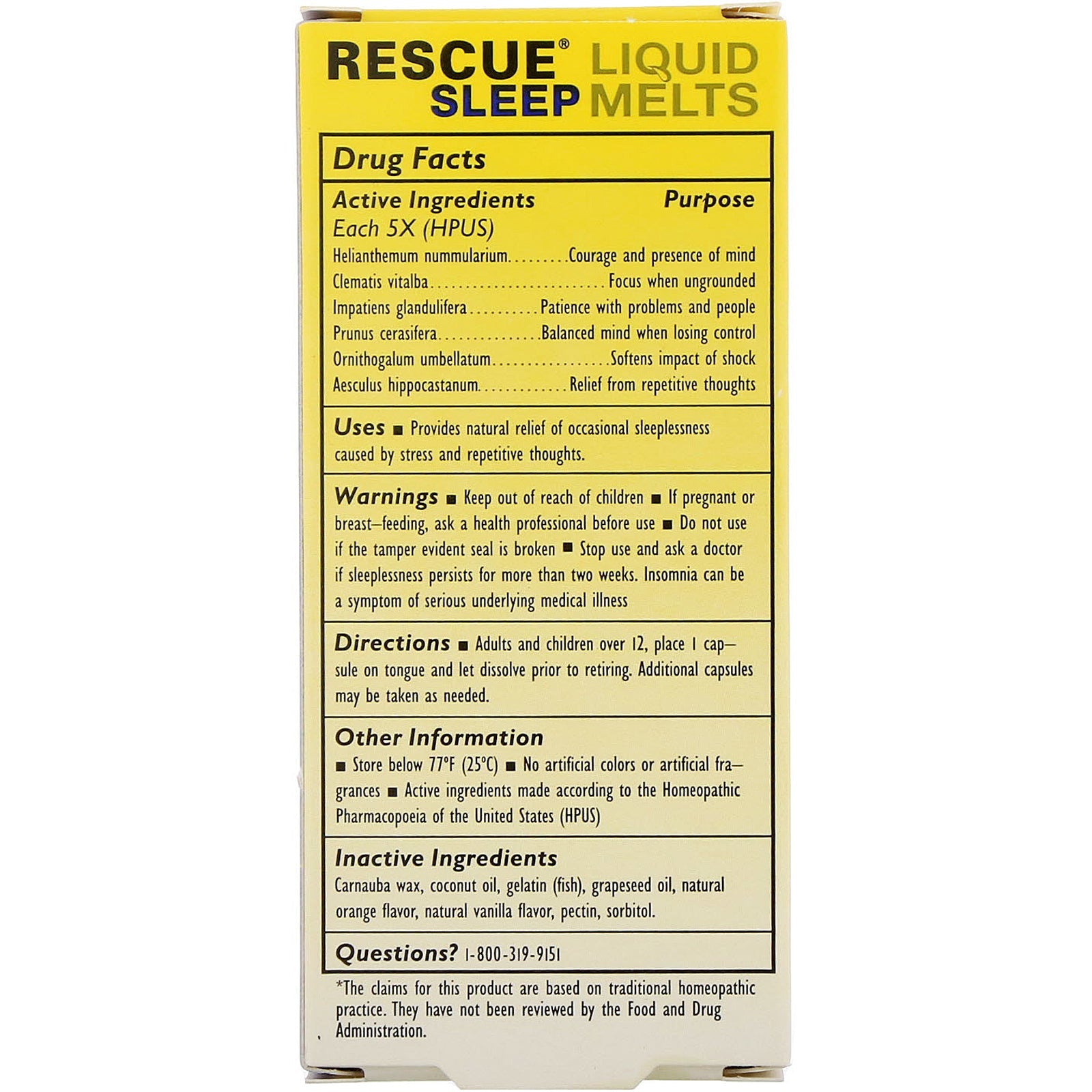 Natural Sleep Aid in a Capsule Dissolvable Non-Habit Forming Alcohol-Free Homeopathic Uses Provides natural relief of occasional sleeplessness caused by stress & repetitive thoughts. All natural, non narcotic and non habit forming, Rescue Sleep Liquid Melts provide relief from occasional sleeplessness caused by stress and repetitive thoughts. Alcohol-free and safe for the whole family.Sugg. UseAdults and children over 12, place 1 capsule on tongue and let dissolve prior to retiring. Additional capsules may be taken as needed.Other IngredientsDrug Facts Active ingredients Each 5X (HPUS) Purpose Helianthemum nummularium Courage and presence of mind Clematis vitalba Focus when ungrounded Impatiens glandulifera Patience with problems and people Prunus cerasifera Balanced mind when losing control Ornithogalum umbellatum Softens impact of shock Aesculus hippocastanum Relief from repetitive thoughts Inactive ingredients : Carnauba wax, coconut oil, gelatin (fish), grapeseed oil, natural orange flavor, natural vanilla flavor, pectin, sorbitol. No artificial colors or artificial fragrances. Active ingredients...