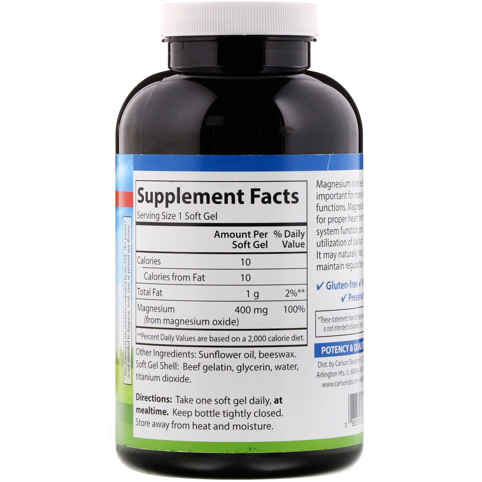 Dietary Supplement Promotes Cardiovascular Health & Muscle Function Gluten-Free Milk/Casein-Free Preservative-Free Potency & Quality Guaranteed An FDA Regulated Facility Magnesium is an essential mineral, important for many vital body functions. Magnesium is responsible for proper heart rhythm, nervous system function, and the normal utilization of calcium and potassium. It may naturally help promote and maintain regular bowel elimination.Sugg. UseTake one soft gel daily, at mealtime.Other IngredientsSunflower oil, beeswax. Soft gel shell: Beef gelatin, glycerin, water, titanium dioxide.Supplement FactsServing Size: 1 Soft Gel Amount Per Soft Gel % Daily Value Calories 10 Calories from Fat 10 Total Fat 1 g 2%** Magnesium (from magnesium oxide) 400 mg 100% ** Percent Daily Values are based on a 2000 calorie diet.DisclaimerWhile VitaminsUK strives to ensure the accuracy of its product images and information, some manufacturing changes to packaging and/or ingredients may be pending update on our site. Although items may occasionally ship with...