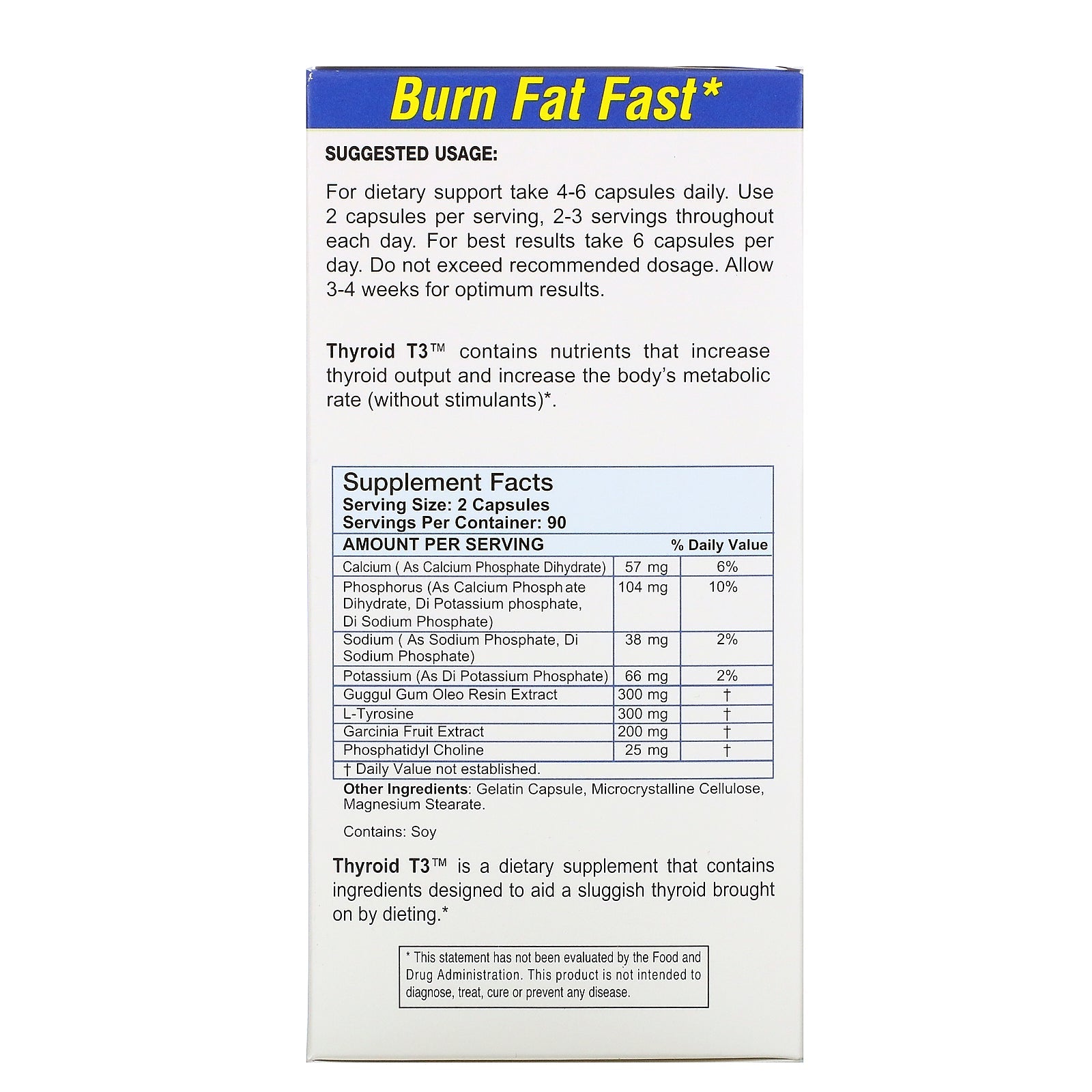 Burn Fat Fast Designed to Boost Thyroid Output & Metabolism Stimulant Free Your Thyroid Controls the Rate of Metabolism Reduced Calorie Diets Have Been Shown to Lower Metabolism Thyroid T3 is Designed to Aid a Sluggish Metabolism Brought on by Dieting Dietary Supplement The Diet Company Thyroid T3 is designed to be used in conjunction with a reduced calorie, healthy diet. In laboratory studies, reduced calorie diets alone have been shown to exhibit healthful benefits, but sometimes cause a slowdown in weight loss. A reduction of active thyroid hormone, a reduction in metabolic rate and a reduction in certain neurotransmitters, all from dieting, may bring a halt to your progress. Instead of cutting back calories further and risking lean body mass, our Thyroid T3 may offer you a better solution. We combine Guggulsterone, Tyrosine, phosphates, Phosphatidyl Choline and Garcinia Cambogia into one of the most unique and effective weight/fat reduction blends. Our Thyroid T3 is effective when used by itself, and may also help other weight loss formulas work more effectively. Thyroid T3 contains nutrients that increase thyroid output and increase the body's metabolic rate (without stimulants) Thyroid T3 is a dietary supplement that contains ingredients designed to aid a sluggish thyroid brought on by dieting.
