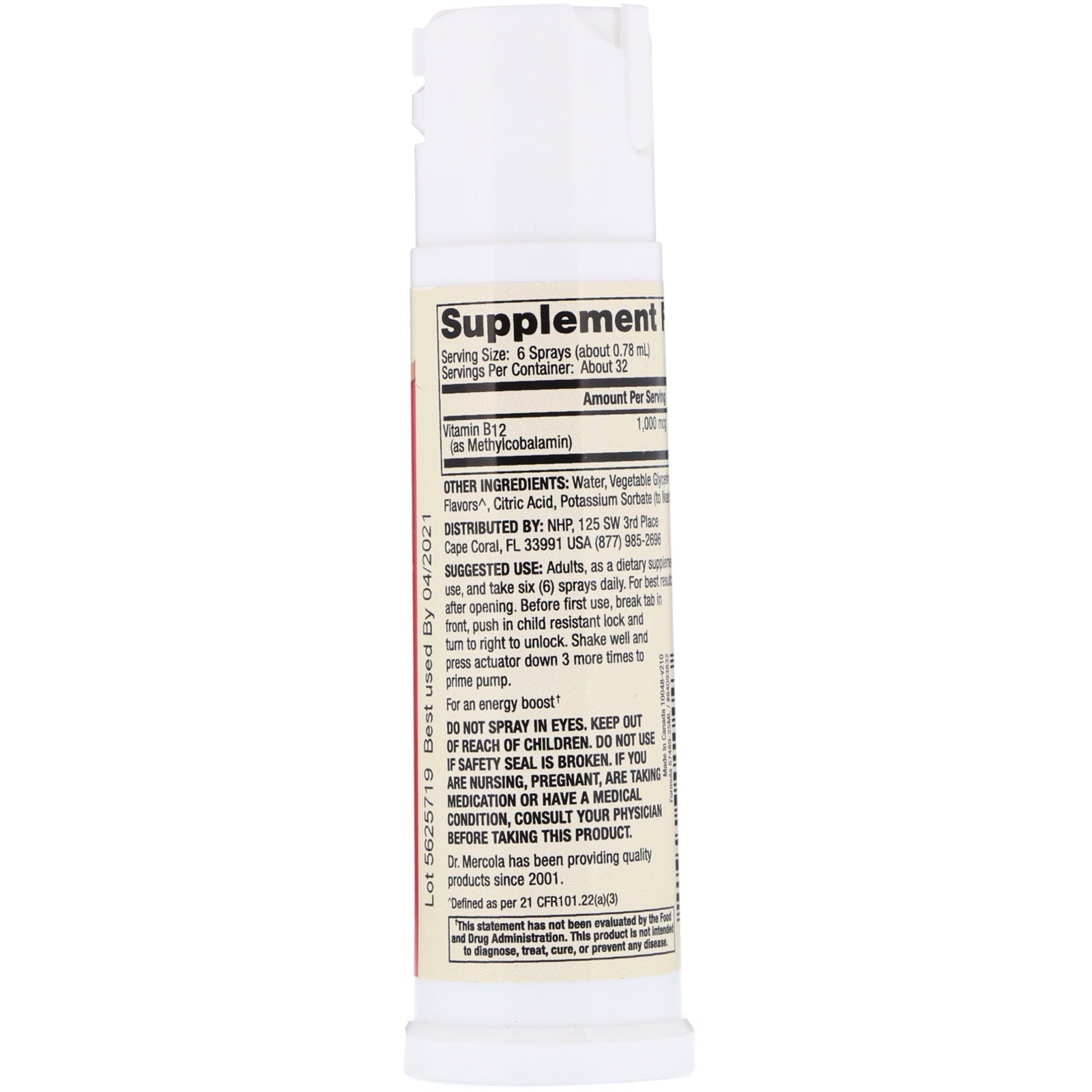With Other Natural Flavors Dietary Supplement For an Energy Boost Dr. Mercola has been providing quality products since 2001Sugg. UseAdult, as a dietary supplement, shake before use, and take six (6) sprays daily. For best results, refrigerate after opening. Before first use, break tab in front, push in child resistant lock and turn to right to unlock. Shake well and press actuator down 3 more times to prime pump.Other IngredientsWater, vegetable glycerin, natural flavorsˆ, citric acid, potassium sorbate (to maintain freshness). ˆDefined as per 21 CFR101.22(a)(3)Supplement FactsServing Size: 6 Sprays (about 0.78 mL) Servings Per Container: About 32 Amount Per Serving: %Daily Value Vitamin B12 (as Methylcobalamin) 1,000 mcg 41667%DisclaimerWhile VitaminsUK strives to ensure the accuracy of its product images and information, some manufacturing changes to packaging and/or ingredients may be pending update on our site. Although items may occasionally ship with alternate packaging, freshness is always guaranteed. We recommend...