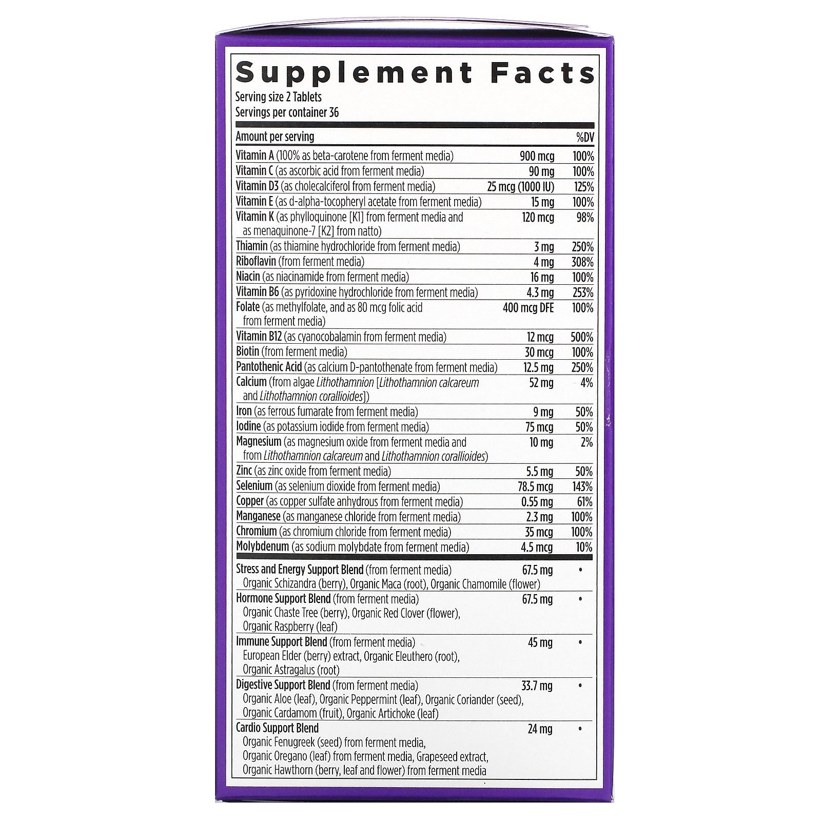 Serving Size: 2 Tablets Serving Per Container: 36 Amount Per Serving %Daily Value Vitamin A (100% as beta-carotene from ferment media) 900 mcg 100% Vitamin C (as ascorbic acid from ferment media) 90 mg 100% Vitamin D3 (as cholecalciferol from ferment media) 25 mcg (1000 IU) 125% Vitamin E (as d-alpha-tocopheryl acetate from ferment media) 15 mg 100% Vitamin K (as phylloquinone [K1] from ferment media and as menaquinone-7 [K2] from natto) 120 mcg 98% Thiamin (as thiamine hydrochloride from ferment media) 3 mg 250% Riboflavin (from ferment media) 4 mg 308% Niacin (as niacinamide from ferment media) 16 mg 100% Vitamin B6 (as pyridoxine hydrochloride from ferment media) 4.3 mg 253% Folate (as methylfolate and as 80 mcg folic acid from ferment media) 400 mcg DFE 100% Vitamin B12 (as cyanocobalamin from ferment media) 12 mcg 500% Biotin (from ferment media) 30 mcg 100% Pantothenic Acid (as calcium D-pantothenate from ferment media) 12.5 mg 250% Calcium (from algae Lithothamnion [Lithothamnion calcareum and Lithothamnion corallioides]) 52 mg 4% Iron (as ferrous fumarate from ferment media) 9 mg 50% Iodine (as potassium iodide from ferment media) 75 mcg 50% Magnesium (as magnesium oxide from ferment media and from Lithothamnion calcareum and Lithothamnion corallioides) 10 mg 2% Zinc (as zinc oxide from ferment media) 5.5 mg 50% Selenium (as selenium dioxide from ferment media) 78.5 mcg 143% Copper (as copper sulfate anhydrous from ferment media) 0.55 mg 61% Manganese (as manganese chloride from ferment media) 2.3 mg 100% Chromium (as chromium chloride from ferment media) 35 mcg 100% Molybdenum (as sodium molybdate from ferment media) 4.5 mcg 10% Stress and Energy Support Blend (from ferment media) Organic Schizandra (berry), Organic Maca (root), Organic Chamomile (flower) 67.5 mg * Hormone Support Blend (from ferment media) Organic Chaste Tree (berry), Organic Red Clover (flower), Organic Raspberry (leaf) 67.5 mg * Immune Support Blend (from ferment media) European Elder (berry) Extract, Organic Eleuthero (root), Organic Astragalus (root) 45 mg * Digestive Support Blend (from ferment media) Organic Aloe (leaf), Organic Peppermint (leaf), Organic Coriander (seed), Organic Cardamom (fruit), Organic Artichoke (leaf) 33.7 mg * Cardio Support Blend Organic Fenugreek (seed) from ferment media, Organic Oregano (leaf) from ferment media, Grapeseed extract, Organic Hawthorn (berry, leaf and flower) from ferment media 24 mg * Organic Turmeric (rhizome) 4 mg from ferment media and 1.2 mg supercritical extract 5.2 mg * Ginger (rhizome) 2.4 mg aqueous extract and 0.6 mg organic supercritical extract 3 mg * *Daily Value (DV) not establishedDisclaimer