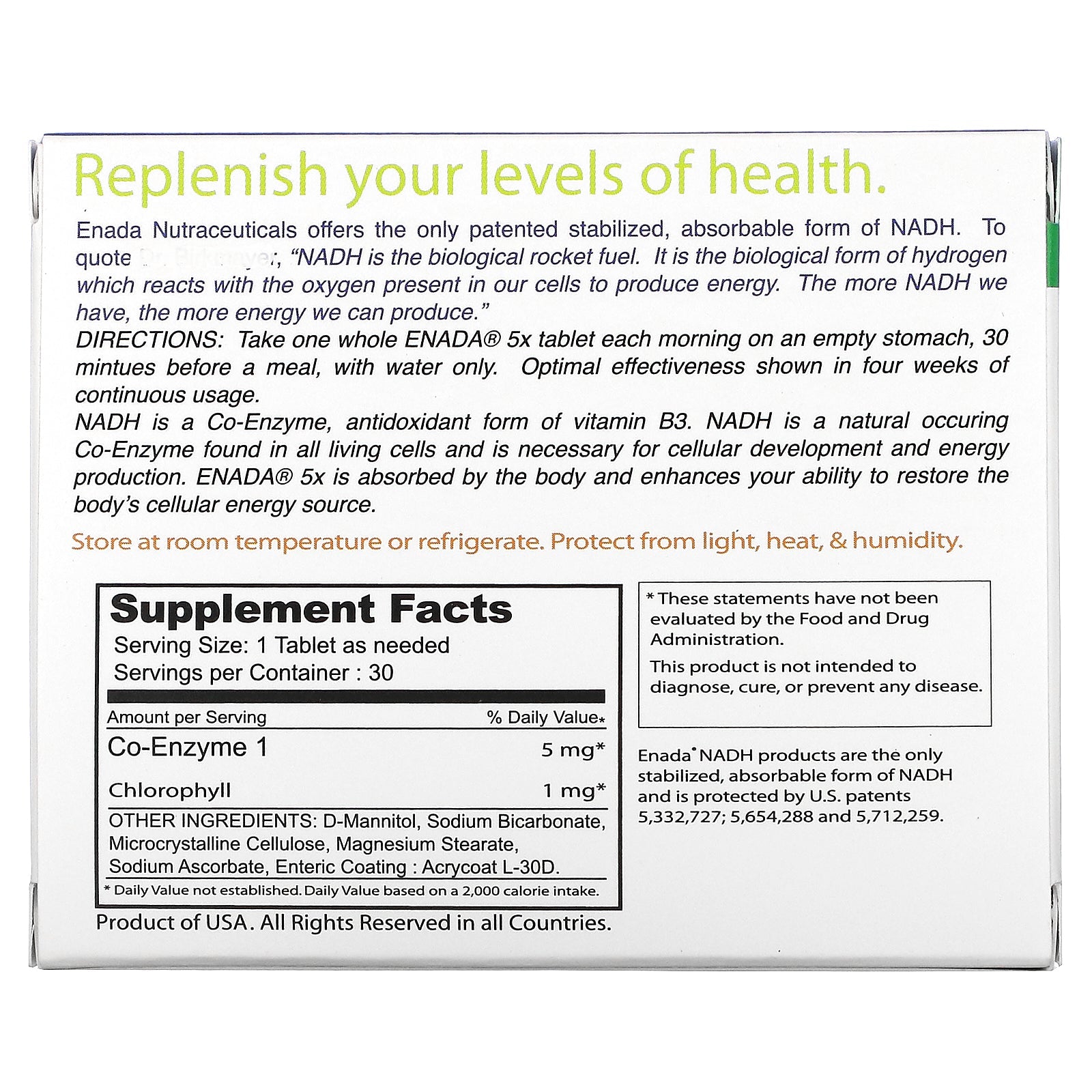 Dietary Supplement Return to Health Immunity Support Antioxidant DNA Repair NADH Body Technology Be Greater Guaranteed for Purity, Freshness and Potency Replenish your levels of health. Enada Nutraceuticals offers the only patented stabilized, absorbable form of NADH. To quote, "NADH is the biological rocket fuel. It is the biological form of hydrogen which reacts with the oxygen present in our cells to produce energy. The more NADH we have, the more energy we can produce." NADH is a Co-Enzyme, antioxidant form of vitamin B3. NADH is a natural occurring Co-Enzyme found in all living cells and is necessary for cellular development and energy production. ENADA ® 5x is absorbed by the body and enhances your ability to restore the body's cellular energy source.Sugg. UseTake one whole ENADA ® 5x tablet each morning on an empty stomach, 30 minutes before a meal, with water only. Optimal effectiveness shown in four weeks...