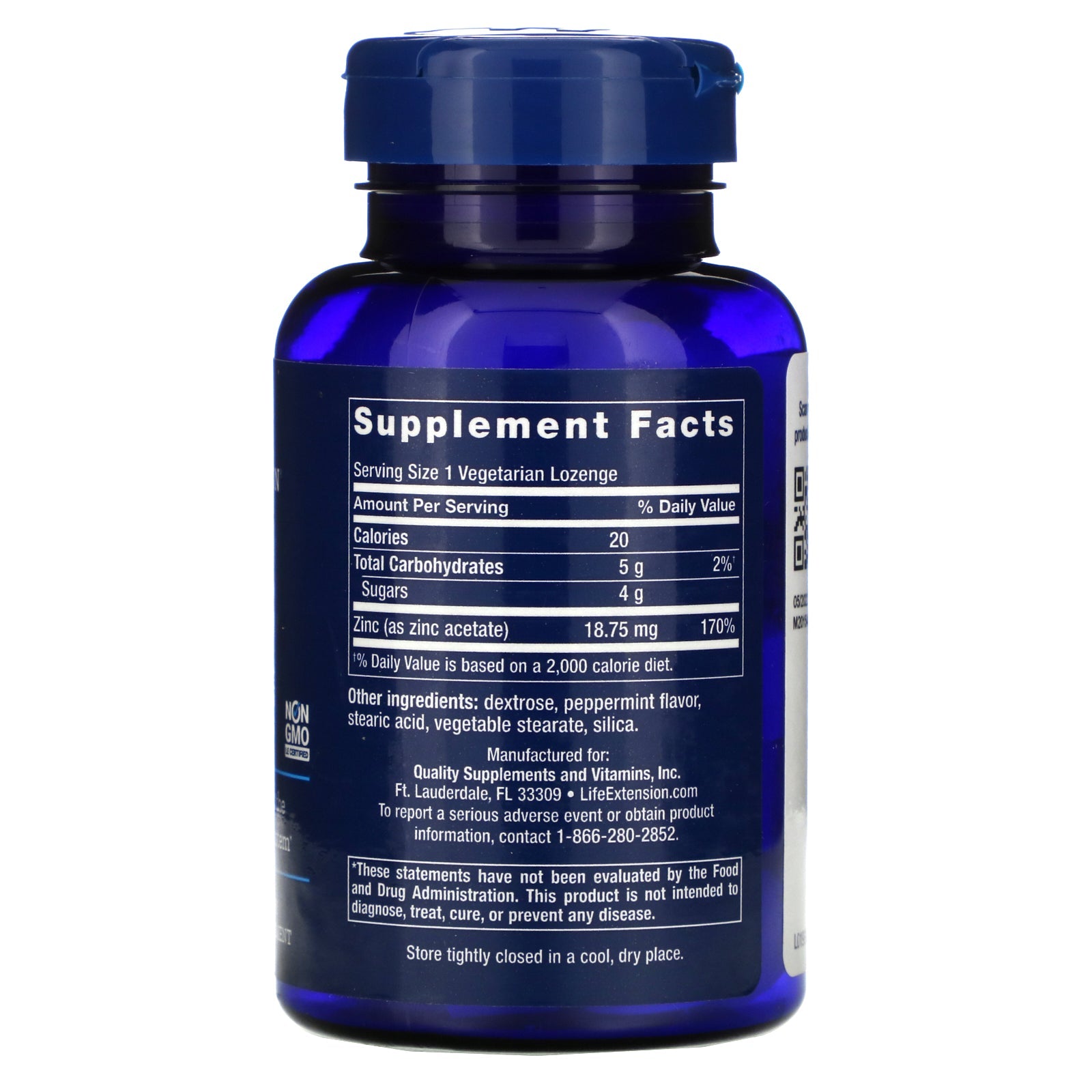 Serving Size: 1 Vegetarian Lozenge Amount Per Serving %Daily Value Calories 20 Total Carbohydrates 5 g 2%† Sugars 4 g Zinc (as zinc acetate) 18.75 mg 170% †% Daily Value is based on a 2,000 calorie diet.Disclaimer