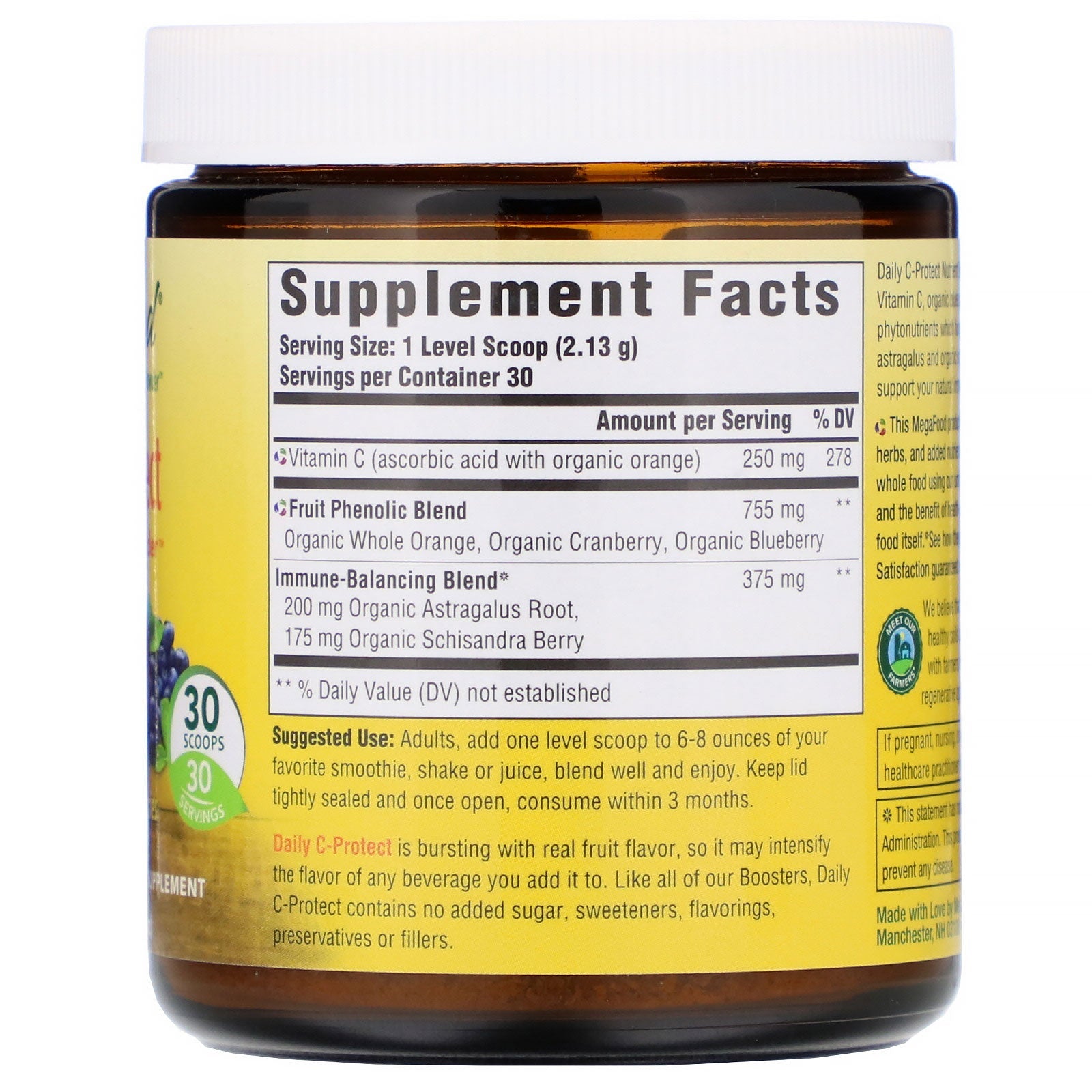 Real Food From Trusted Farmer Partners Certified B Corporation Non GMO Project Verified Glyphosate Residue Free Tested Free of 125+ Pesticides & Herbicides NSF Certified Gluten-Free Certified Vegan Kosher Dairy Free Soy Free Fresh From Farm to Powder™ 30 Scoops 30 Servings With Blueberries, Cranberries & Whole Oranges Unsweetened Powder Dietary Supplement Daily C-Protect Nutrient Booster Powder contains FoodState® Vitamin C, organic blueberries and organic cranberries to provide phytonutrients which function as powerful antioxidants. Organic astragalus and organic schisandra berry herbs are included to support your natural immune defenses.Sugg. UseAdults, add one level scoop to 6-8 ounces of your favorite smoothie, shake or juice, blend well and enjoy. Daily C-Protect is bursting with real fruit flavor, so it may intensify the flavor of any beverage you add it to.Other IngredientsLike all of our Boosters. Daily C-Protect contains no added sugar, sweeteners, flavorings, preservatives or fillers.Supplement FactsServing Size: 1 Level Scoop...