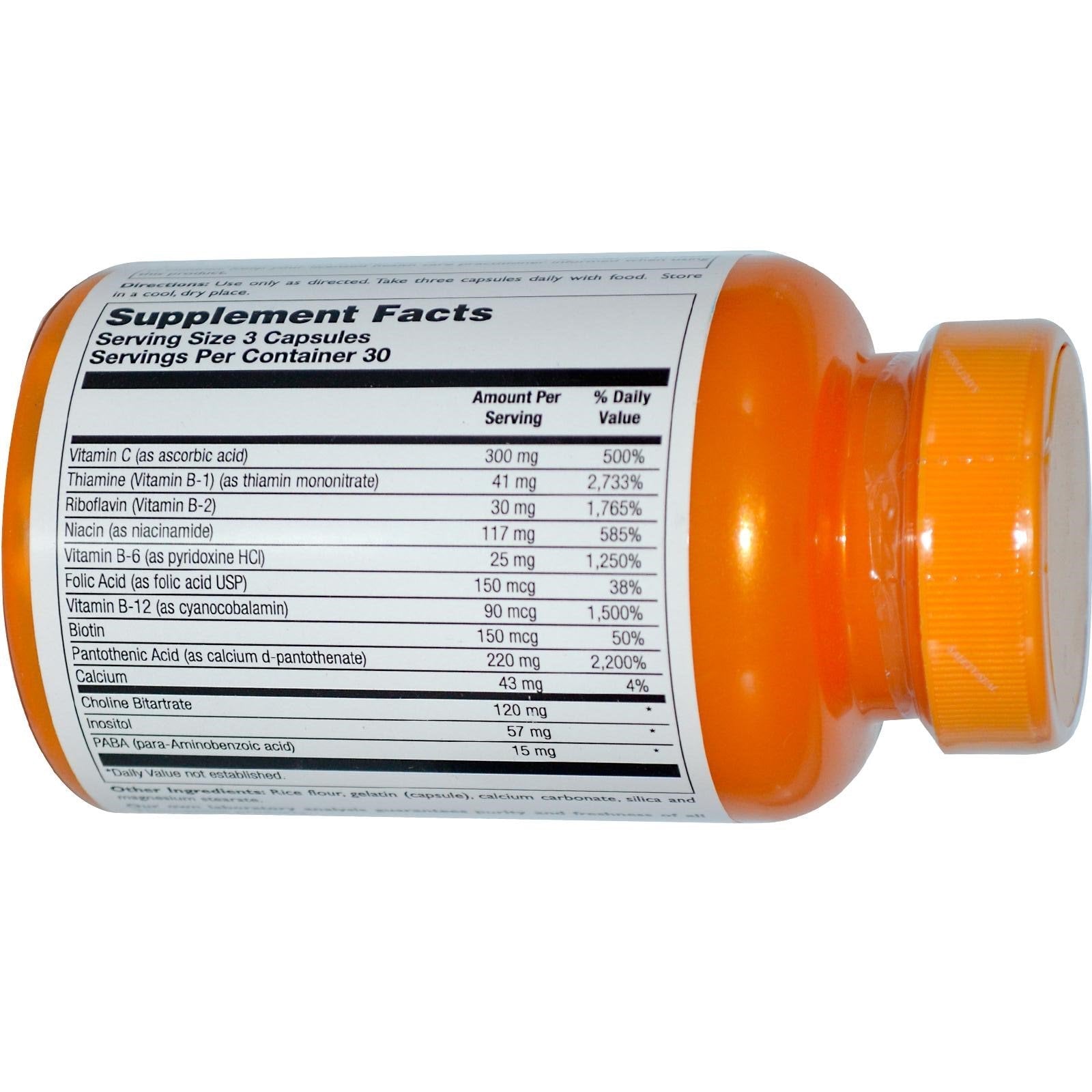Serving Size: 3 Capsules Servings per Container: 30 Amount Per Serving % Daily Value Vitamin C (as ascorbic acid) 300 mg 500% Thiamine (Vitamin B-1) (as thiamin mononitrate) 41 mg 2,733% Riboflavin (Vitamin B-2) 30 mg 1,765% Niacin (as niacinamide) 117 mg 585% Vitamin B-6 (as pyridoxine HCl) 25 mg 1,250% Folic Acid (as folic acid USP) 150 mcg 38% Vitamin B-12 (as cyanocobalamin) 90 mcg 1,500% Biotin 150 mcg 50% Pantothenic Acid (as calcium d-pantothenate) 220 mg 2,200% Calcium 43 mg 4% Choline Bitartrate 120 mg * Inositol 57 mg * PABA (para-Aminobenzoic acid) 15 mg * *Daily Value not established.