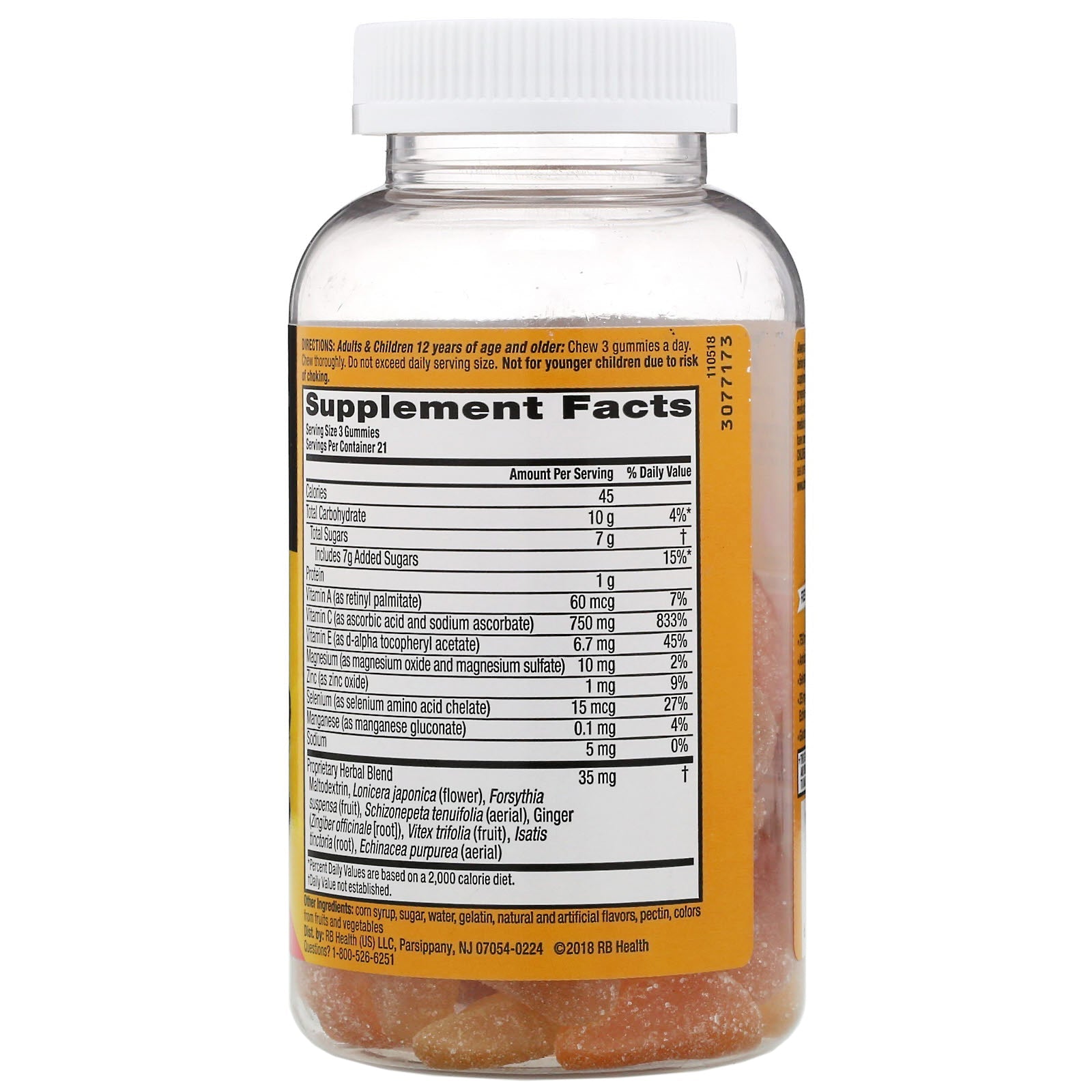 Helps Support Your Immune System Crafted Blend: Vitamin C and 9 Vitamins, Minerals & Herbs Naturally and Artificially Flavored Health - Hygiene - Home Zesty Orange, Very Berry, Grapefruit 1 Serving Contains 750 mg of Vitamin C Antioxidants (Vitamin C & E) Selenium 35 mg of Herbal Blend including Echinacea & Ginger Gluten FreeSugg. UseAdults and children 12 years of age and older: Chew 3 gummies a day. Chew thoroughly. Do not exceed daily serving size. Not for younger children due to risk of choking.Other IngredientsCorn syrup, sugar, water, gelatin, pectin, natural and artificial flavors, pectin, colors from fruits and vegetables.Supplement FactsServing Size: 3 Gummies Servings Per Container: 21 Amount Per Serving % Daily Value Calories 45 Total Carbohydrate 10 g 4%* Total Sugars 7 g † Includes 7 g Added Sugars 15%* Protein 1 g Vitamin A (as retinyl palmitate) 60 mcg 7% Vitamin C (as ascorbic acid and...