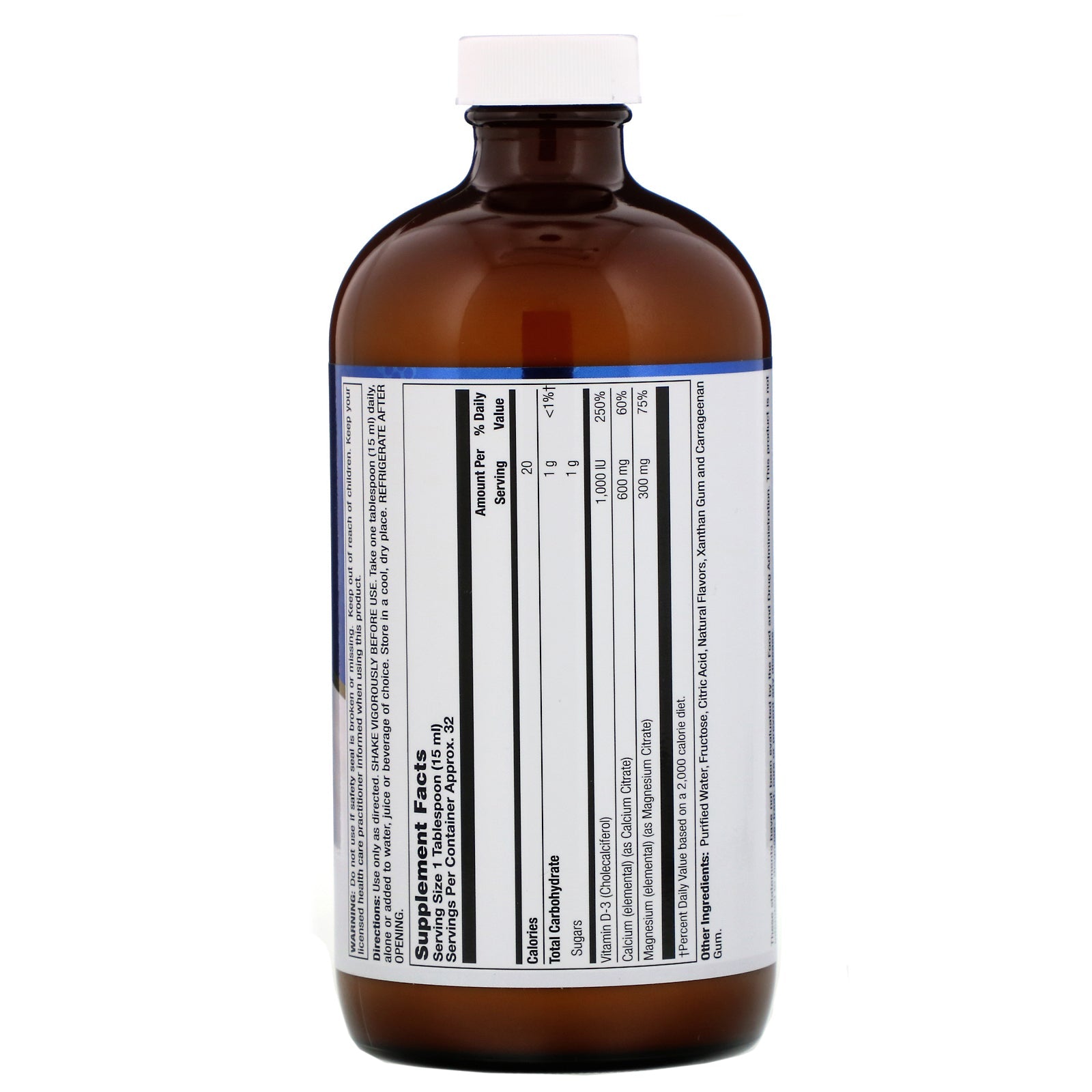 Serving Size: 1 Tablespoon (15 ml) Serving Per Container: Approx. 32 Amount Per Serving % Daily Value Calories 20 Total Carbohydrate 1 g <1%† Sugars 1 g Vitamin D-3 (Cholecalciferol) 1,000 IU 250% Calcium (elemental) (as Calcium Citrate) 600 mg 60% Magnesium (elemental) (as Magnesium Citrate) 300 mg 75% †Percent Daily Value based on a 2,000 calorie diet.