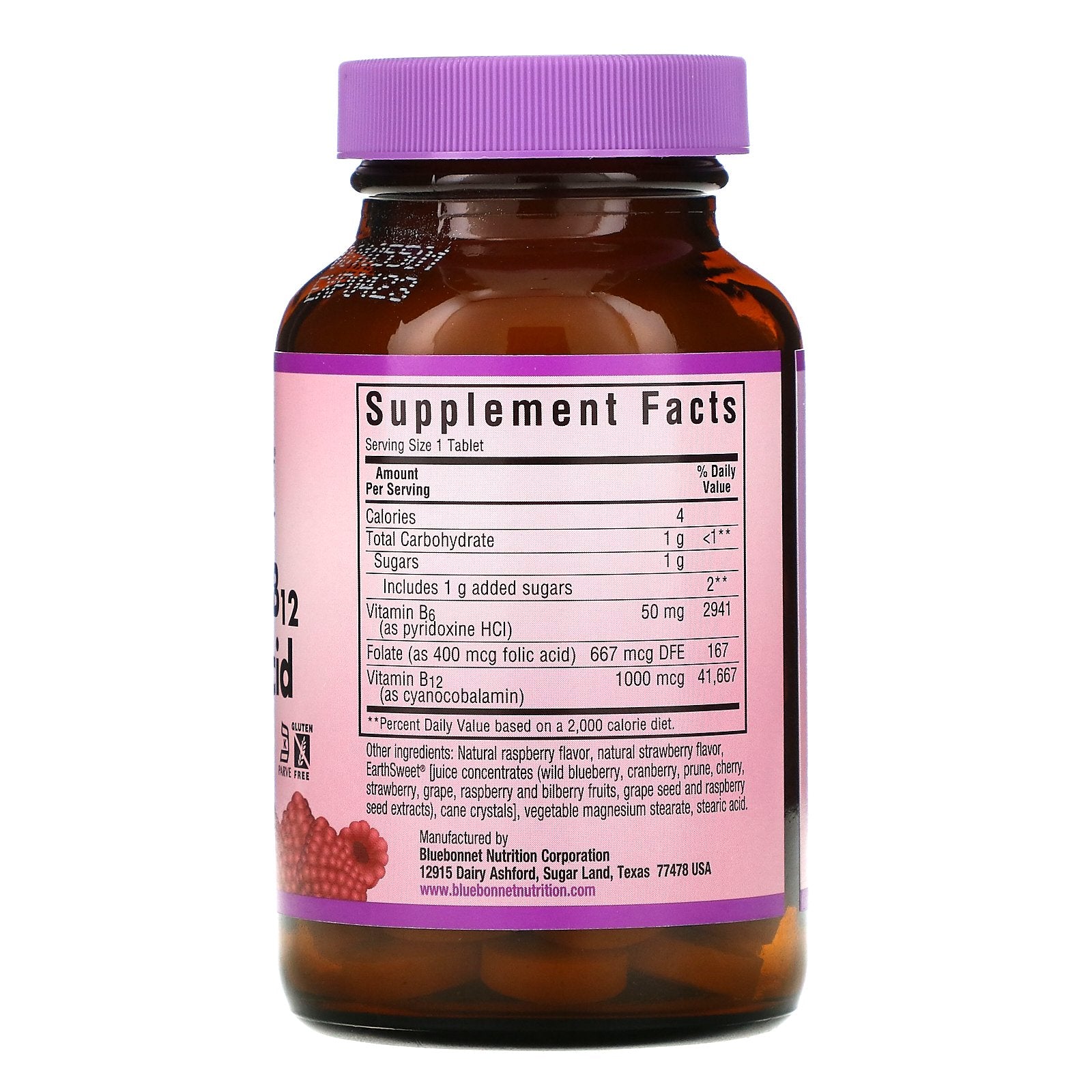 Vegan Dietary Supplement Kosher Parve Gluten Free Bluebonnet's EarthSweet® Chewables Vitamin B6, B12 Plus Folic Acid Tablets contain crystalline vitamin B-6 (pyridoxine HCl), vitamin B12 (cyanocobalamin) and folic acid that supports cellular energy production and nervous system health in a delicious raspberry flavor. Sweetened with EarthSweet®, a proprietary sweetening mix of juice concentrates (wild blueberry, cranberry, prune, cherry, strawberry, grape, raspberry and bilberry fruits, grape seed and raspberry seed extracts) and cane crystals. Available in chewable tablets for maximum assimilation and absorption.Sugg. UseAs a dietary supplement, take one chewable tablet daily or as directed by a healthcare practitioner.Other IngredientsNatural raspberry flavor, natural strawberry flavor, EarthSweet® [juice concentrates (wild blueberry, cranberry, prune, cherry, strawberry, grape, raspberry and bilberry fruits, grape seed and raspberry seed extracts), cane crystals], vegetable magnesium stearate, stearic acid. Free of milk, egg, fish, crustacean shellfish, tree nuts, peanuts, wheat and soybeans. Also free of yeast, gluten, barley,...