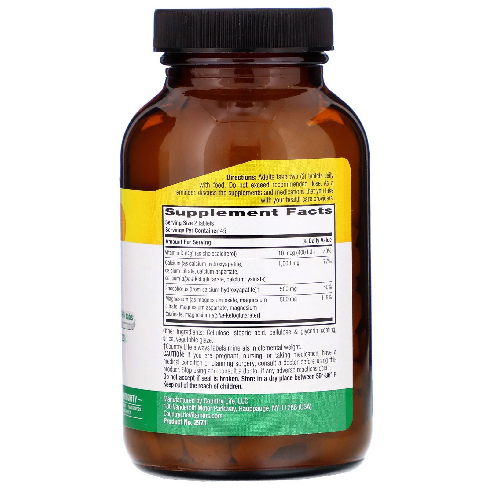 Serving Size: 2 tablets Serving Per Container: 45 Amount Per Serving % Daily Value Vitamin D (D3) (as cholecalciferol) 10 mcg (400 I.U.) 50% Calcium (as calcium hydroxyapatite, calcium citrate, calcium aspartate, calcium alpha-ketoglutarate, lysinate)† 1,000 mg 77% Phosphorus (from calcium hydroxyapatite)† 500 mg 50% Magnesium (as magnesium oxide, magnesium citrate, magnesium aspartate, taurinate, alpha-ketoglutarate)† 500 mg 119% †Country Life always labels minerals in elemental weight.Disclaimer
