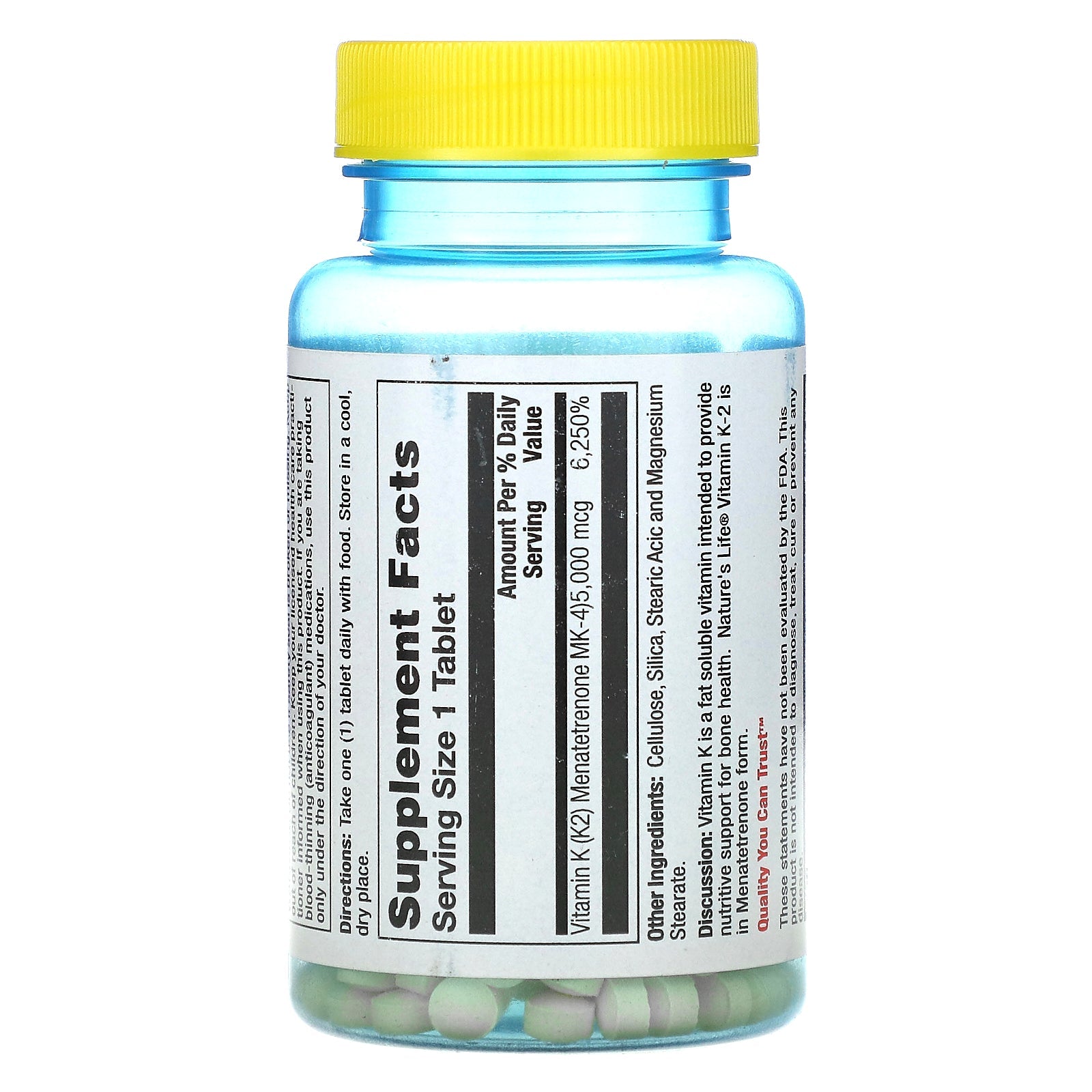 Sun Food Energy ® Bone Health Menatetrenone 1 Daily Dietary Supplement Quality You Can Trust ™ Vitamin K is a fat soluble vitamin intended to provide nutritive support for bone health. Nature's Life ® Vitamin K-2 is in Menatetrenone form.Sugg. UseTake one (1) tablet daily with food.Other IngredientsCellulose, silica, stearic acid and magnesium stearate.Supplement FactsServing Size: 1 Tablet Amount Per Serving %Daily Value Vitamin K (K2) Menatetrenone MK-4) 5,000 mcg 6,250%DisclaimerWhile VitaminsUK strives to ensure the accuracy of its product images and information, some manufacturing changes to packaging and/or ingredients may be pending update on our site. Although items may occasionally ship with alternate packaging, freshness is always guaranteed. We recommend that you read labels, warnings and directions of all products before use and not rely solely on the information provided by VitaminsUK.