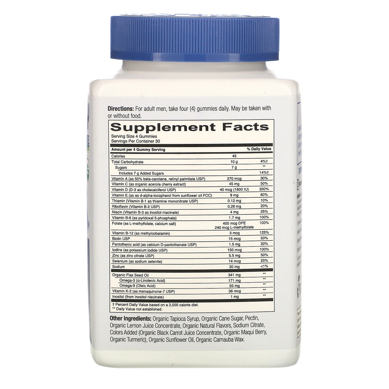 Serving Size: 4 Gummies Servings Per Container: 30 Amount Per Serving % Daily Value Calories 45 Total Carbohydrate 10 g 4%† Sugars 7 g ** Includes 7 g Added Sugars 14%† Vitamin A (as 50% beta-carotene, retinyl palmitate USP) 270 mcg 30% Vitamin C (as acerola cherry extract) 45 mg 50% Vitamin D (D-3 as cholecalciferol USP) 40 mcg (1600 IU) 200% Vitamin E (as d-alpha-tocopherol from sunflower oil FCC) 9 mg 60% Thiamin (Vitamin B-1 as thiamine mononitrate USP) 0.12 mg 10% Riboflavin (Vitamin B-2 USP) 0.26 mg 20% Niacin (Vitamin B-3 as inositol niacinate) 4 mg 25% Vitamin B-6 (as pyridoxal 5-phosphate) 1.7 mg 100% Folate (as L-methylfolate, calcium salt) 400 mcg DFE 240 mcg L-methylfolate 100% Vitamin B-12 (as methylcobalamin) 3 mcg 125% Biotin USP 15 mcg 50% Pantothenic acid (as calcium D-pantothenate USP) 1.5 mg 30% Iodine (as potassium iodine USP) 150 mcg 100% Zinc (as zinc citrate USP) 5.5 mg 50% Selenium (as sodium selenite) 14 mcg 25% Sodium 20 mg <1% Flax Seed Oil 341 mg ** Omega-3 (a-linolenic Acid) 171 mg ** Omega-9 (Oleic Acid) 55 mg ** Vitamin K-2 (as menaquinone-7 USP) 36 mcg ** Inositol (from inositol niacinate) 1 mg ** †Percent Daily Value based on a 2,000 calorie diet. **Daily Value not established.Disclaimer