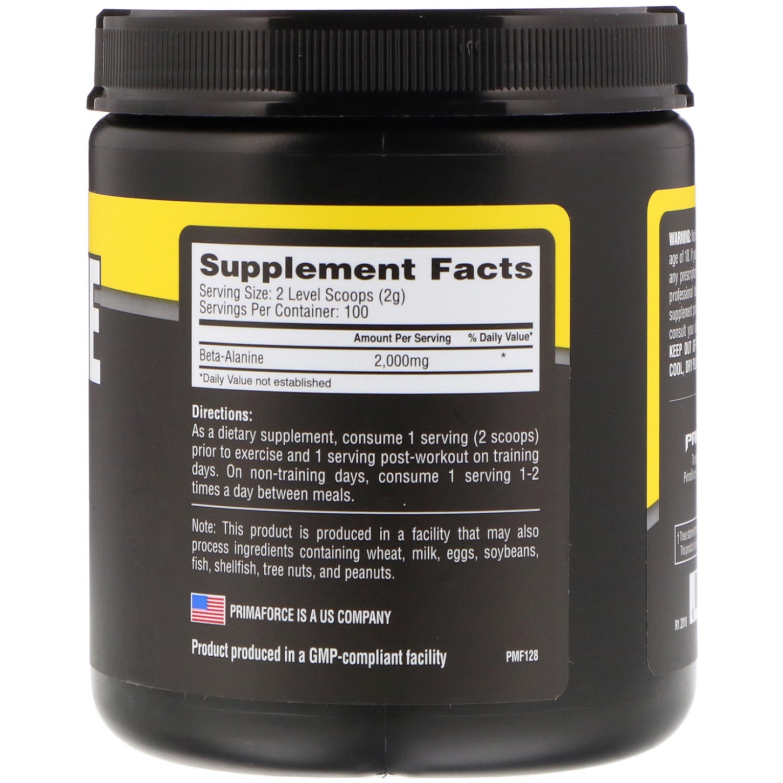Tested for Purity and Potency Enables Harder Training Reduces Fatigue Enhances Strength Performance Aids Lean Mass Gains Dietary SupplementSugg. UseAs a dietary supplement, consume 1 serving (2 scoops) prior to exercise and 1 serving post-workout on training days. On non-training days, consume 1 serving 1-2 times a day between meals.Other IngredientsNote: This product is produced in facility that may also process ingredients containing wheat, milk, eggs, soybeans, fish, shellfish, tree nuts, and peanuts. Product produced in a GMP-compliant facility.Supplement FactsServing Size: 2 Levels Scoops (2 g) Servings Per Container: 100 Amount Per Serving %Daily Value* Beta-Alanine 2,000 mg * *Daily Value not established.DisclaimerWhile VitaminsUK strives to ensure the accuracy of its product images and information, some manufacturing changes to packaging and/or ingredients may be pending update on our site. Although items may occasionally ship with alternate packaging, freshness is always guaranteed. We recommend that you read labels, warnings and directions...