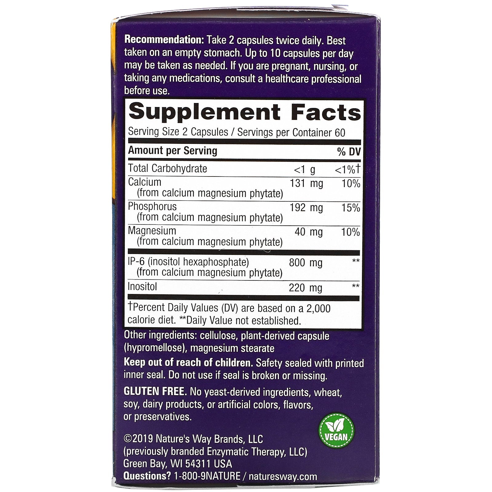 Serving Size: 2 Capsules Servings per container: 60 Amount Per Serving % Daily Value Total Carbohydrate <1 g <1%† Calcium (from calcium magnesium phytate) 131 mg 10% Phosphorus (from calcium magnesium phytate) 192 mg 15% Magnesium (from calcium magnesium phytate) 40 mg 10% IP-6 (inositol hexaphosphate) (from calcium magnesium phytate) 800 mg ** Inositol 220 mg ** †Percent Daily Values (DV) are based on a 2,000 calorie diet. **Daily Value not established.Disclaimer