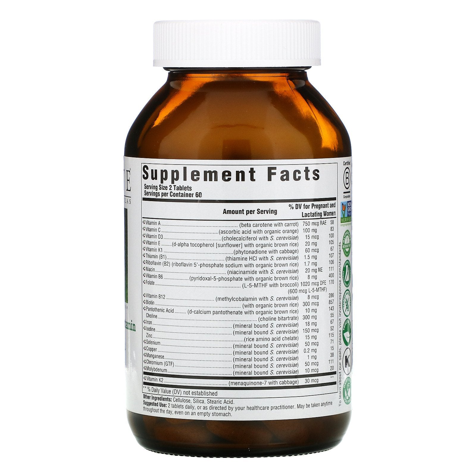 Serving Size: 2 Tablets Servings Per Container: 60 Amount Per Serving % DV for Pregnant and Lactating Women •Vitamin A (beta carotene in carrot) 750 mcg RAE 58 •Vitamin C (ascorbic acid with organic orange) 100 mg 83 •Vitamin D3 (cholecalciferol with S. cerevisiae) 15 mcg 100 •Vitamin E (d-alpha tocopherol [sunflower] with organic brown rice) 20 mg 105 •Vitamin K1 (phytonadione with cabbage) 60 mcg 67 •Thiamin (B1) (thiamine HCI with S. cerevisiae) 1.5 mg 107 •Riboflavin (B2) (riboflavin 5'-phosphate sodium with organic brown rice) 1.7 mg 106 •Niacin (niacinamide with S. cerevisiae) 20 mg NE 111 •Vitamin B6 (pyriodixal-5- phosphate with organic brown rice) 8 mg 400 •Folate (L-5-MTHF with broccoli) 1020 mcg DFE (600 mcg L-5-MTHF) 170 •Vitamin B12 (methylcobalamin with S. cerevisiae) 8 mcg 286 •Biotin (with organic brown rice) 300 mcg 857 •Pantothenic Acid (d-calcium pantothenate with organic brown rice) 10 mg 143 Choline (choline bitartrate) 300 mg 55 •Iron (mineral bound S. cerevisiae) 18 mg 67 •Iodine (mineral bound S. cerevisiae) 150 mcg 52 Zinc (rice amino acid chelate) 15 mg 115 •Selenium (mineral bound S. cerevisiae) 50 mcg 71 •Copper (mineral bound S. cerevisiae) 0.2 mg 15 •Manganese (mineral bound S. cerevisiae) 1 mg 38 •Chromium (GTF) (mineral bound S. cerevisiae) 50 mcg 111 •Molybdenum (mineral bound S. cerevisiae) 10 mcg 20 •Vitamin K2 (menaquinone-7 with cabbage) 30 mcg ** ** % Daily Value (DV) not established •In this INNATE Response product each vitamin or mineral is paired with an ideal whole food using our unique process to deliver guaranteed potency and the benefit of health-promoting compounds present in the whole food itself.Disclaimer