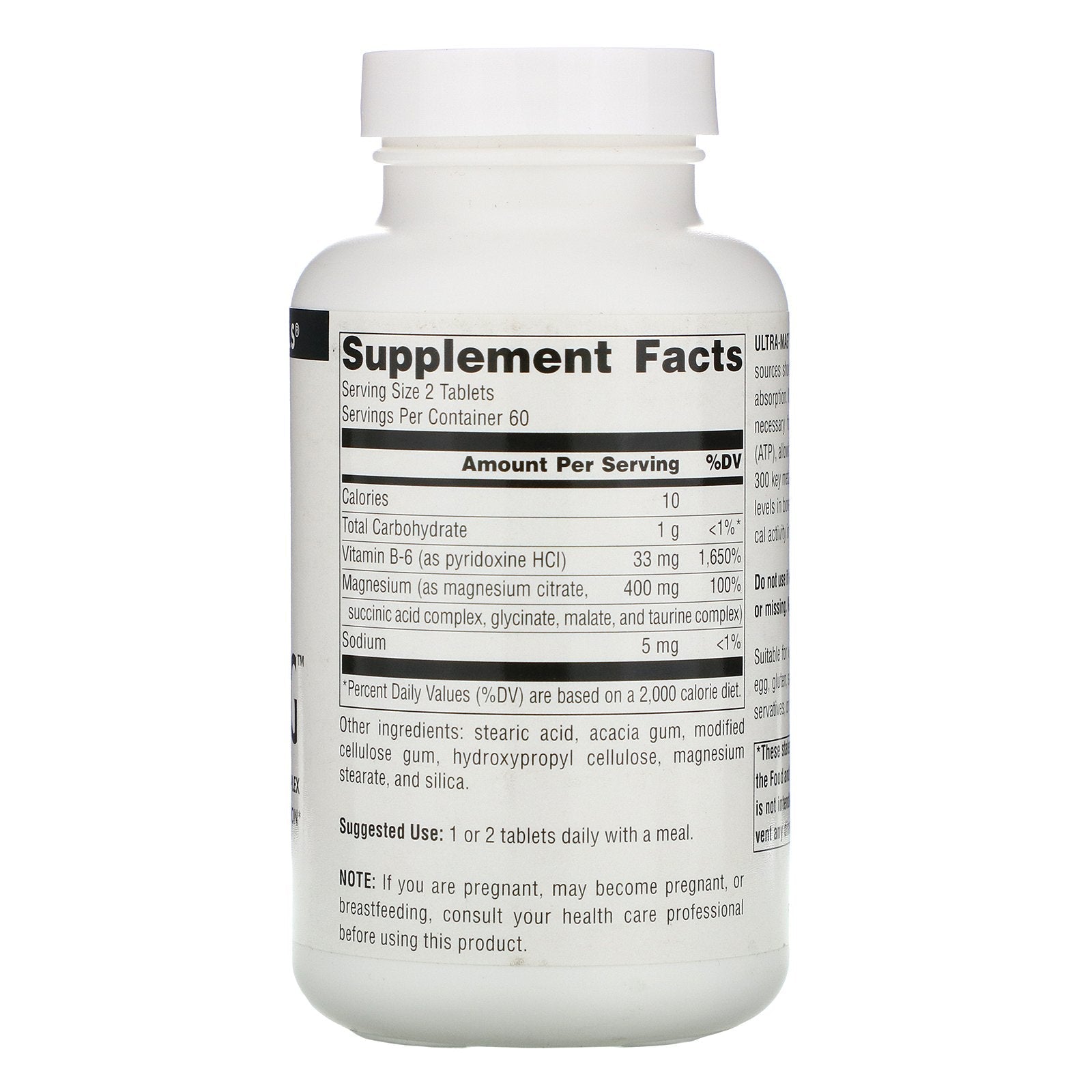Dietary Supplement High-Efficiency Magnesium Complex Maintains Muscle & Nerve Function Suitable for Vegetarians Ultra-Mag™ is made with a balanced blend of sources shown to have high bioavailability and absorption. Magnesium is an essential mineral, necessary for producing and storing energy (ATP), allowing muscles to relax, activating over 300 key metabolic enzymes, controlling calcium levels in bones and teeth, and regulating electrical activity in nerve cells.Sugg. Use1 or 2 tablets daily with a meal.Other IngredientsStearic acid, acacia gum, modified cellulose gum, hydroxypropyl cellulose, magnesium stearate, and silica. Contains no yeast, dairy, egg, gluten, soy or wheat. Contains no sugar, preservatives or artificial color, flavor or fragrance.Supplement FactsServing Size: 2 Tablets Servings Per Container: 60 Amount Per Serving %Daily Value Calories 10 Total Carbohydrate 1 g <1%* Vitamin B-6 (as pyridoxine HCl) 33 mg 1,650% Magnesium (as magnesium citrate, succinic acid complex, glycinate, malate, and taurinate complex) 400 mg 100% Sodium 5...