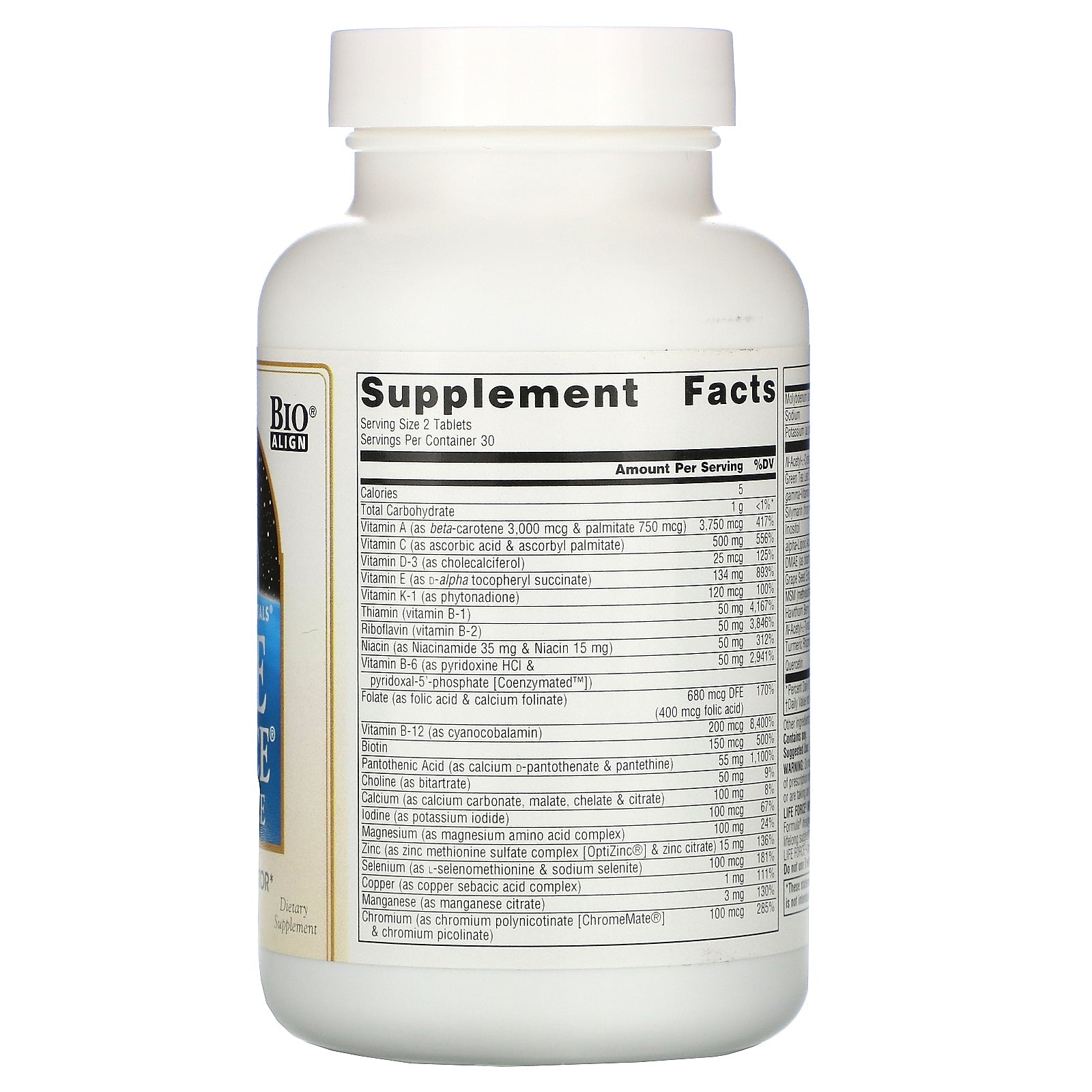 Serving Size: 2 Tablets Servings per Container: 30 Amount Per Serving % DV Calories 5 Total Carbohydrate 1 g <1%* Vitamin A (as beta-carotene 3,000 mcg & palmitate 750 mcg) 3,750 mg 417% Vitamin C (as ascorbic acid & ascorbyl palmitate) 500 mg 556% Vitamin D-3 (as cholecalciferol) 25 mcg 125% Vitamin E (as D-alpha tocopheryl succinate) 134 mg 893% Vitamin K-1 (as phytonadione) 120 mcg 100% Thiamin (vitamin B-1) 50 mg 4,167% Riboflavin (vitamin B-2) 50 mg 3,846% Niacinamide (as Niacinamide 35 mg & Niacin 15 mg) 50 mg 312% Vitamin B-6 (as pyridoxine HCl & pyridoxal-5'-phosphate [Coenzymated™]) 50 mg 2,941% Folate (as folic acid & calcium folinate) 680 mcg DFE (400 mcg folic acid) 170% Vitamin B-12 (as cyanocobalamin) 200 mcg 8,400% Biotin 150 mcg 500% Pantothenic Acid (as calcium D-pantothenate & pantethine) 55 mg 1,100% Choline (as bitartrate) 50 mg 9% Calcium (as calcium carbonate, malate, chelate & citrate) 100 mg 8% Iodine (as potassium iodide) 100 mcg 67% Magnesium (as magnesium amino acid complex) 100 mg 24% Zinc (as zinc methionine sulfate complex [OptiZinc®] & zinc citrate) 15 mg 136% Selenium (as L-selenomethionine & sodium selenite) 100 mcg 181% Copper (as copper sebacic acid complex) 1 mg 111% Manganese (as manganese citrate) 3 mg 130% Chromium (as chromium polynicotinate [ChromeMate®] & chromium picolinate) 100 mcg 285% Molybdenum (as molybdenum amino acid complex) 100 mcg 222% Sodium 5 mg <1% Potassium (as potassium citrate) 50 mg 1% N-Acetyl-L-Cysteine 150 mg † Green Tea Leaf Extract 70 mg † gamma-Vitamin E Complex 67 mg † Silymarin (from milk thistle seed ext.) 60 mg † Inositol 50 mg † alpha-Lipoic Acid & R-Lipoic Acid 40 mg † DMAE (as bitartrate) 30 mg † Grape Seed Extract (Proanthodyn™) 30 mg † MSM (methylsulfonylmethane [OptiMSM®]) 25 mg † Hawthorn Berry Extract 25 mg † N-Acetyl-L-Tyrosine 25 mg † Turmeric Rhizome Extract 25 mg † Quercetin 25 mg † Natural trans-Resveratrol (from Polygonum cuspidatum Root Extract) 20 mg † Coenzyme Q10 20 mg † Ginkgo Leaf Extract (24% flavone glycosides & 6% terpene lactones) 20 mg † Tocotrienol Complex (EVNolMax™) 10 mg † Bilberry Fruit Ext. (32% anthocyanosides) 5 mg † Rutin 5 mg † Black Pepper Fruit Extract (BioPerine®) 3 mg † Lycopene 3 mg † Boron (as boron amino acid complex) 2 mg † Lutein 2 mg † Astaxanthin 100 mcg † *Percent Daily Values (%DV) are based on a 2,000 calorie diet. †Daily Value not established.Disclaimer