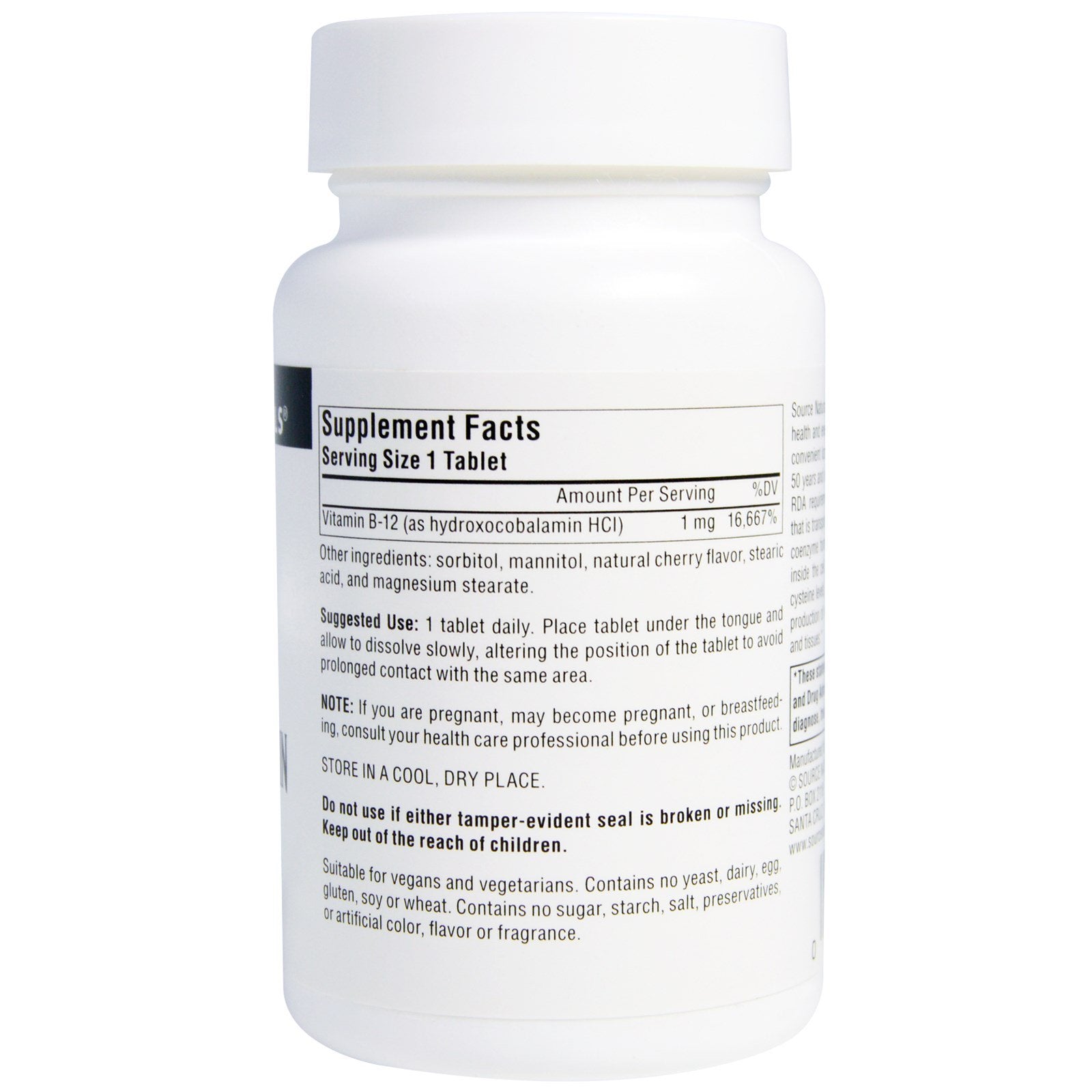 Dietary Supplement Suitable for Vegans and Vegetarians Source Naturals Hydroxocobalamin B-12 supports brain health and energy levels with a meaningful dose of B-12 in a convenient lozenge form. This is especially helpful for adults 50 years and older who may need assistance in meeting their RDA requirements. Hydroxocobalamin is the form of B-12 that is transported in the blood, before it is converted into the coenzyme forms of methylcobalamin or adenosylcobalamin inside the cell. Vitamin B-12 helps support normal homocysteine levels, healthy brain cells and nerve tissues, and the production of red blood cells that carry oxygen to the cells and tissues.Sugg. Use1 tablet daily. Place tablet under the tongue and allow to dissolve slowly, altering the position of the tablet to avoid prolonged contact with the same area.Other IngredientsSorbitol, mannitol, natural cherry flavor, stearic acid, and magnesium stearate. Contains no yeast, dairy, egg, gluten, soy or wheat. Contains no...