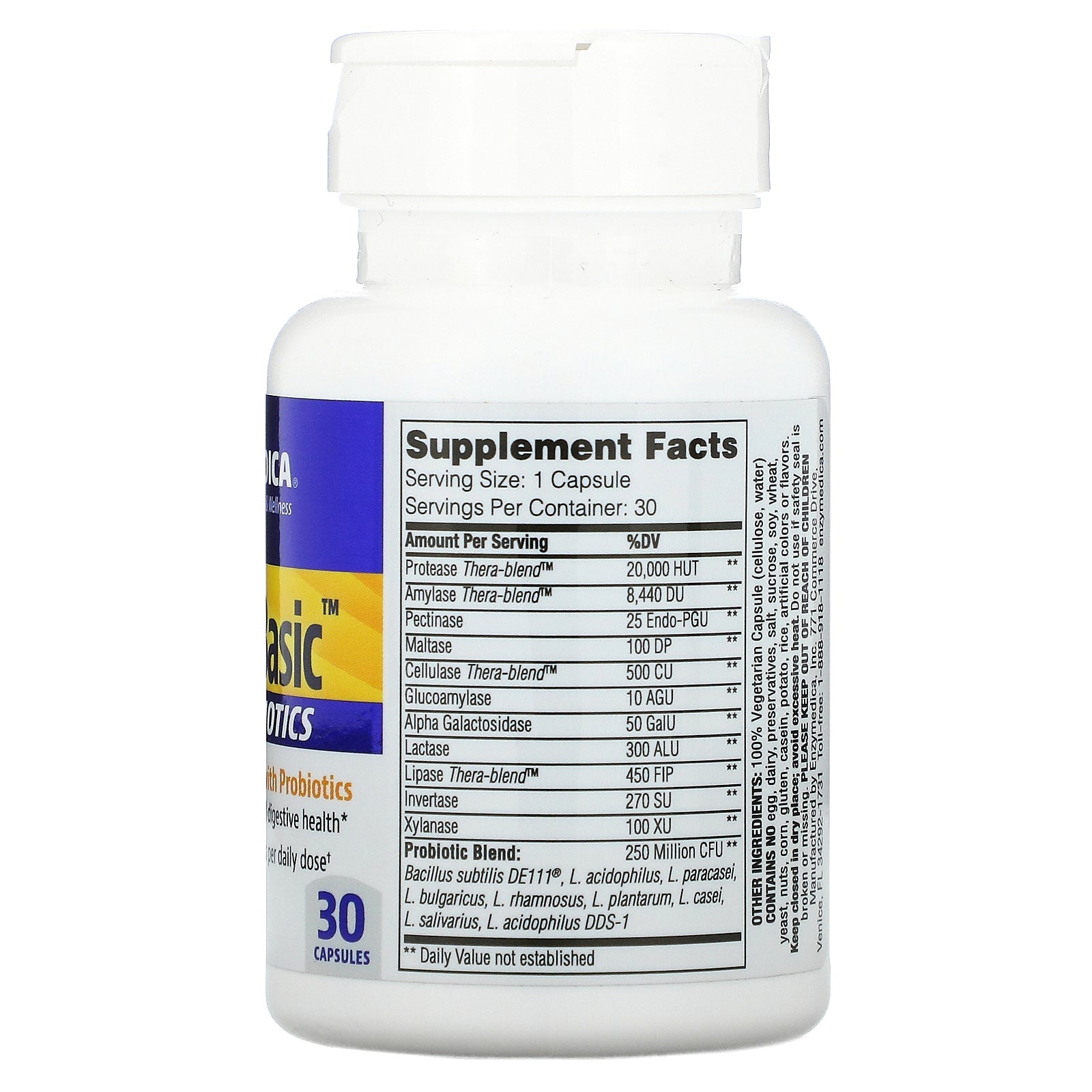 Serving Size: 1 Capsule Servings Per Container: 30 Amount Per Serving %DV Protease Thera-blend ™ 20,000 HUT ** Amylase Thera-blend ™ 8,440 DU ** Pectinase 25 Endo-PGU ** Maltase 100 DP ** Cellulase Thera-blend ™ 500 CU ** Glucoamylase 10 AGU ** Alpha Galactosidase 50 GalU ** Lactase 300 ALU ** Lipase Thera-blend ™ 450 FIP ** Invertase 270 SU ** Xylanase 100 XU ** Probiotic Blend: Bacillus subtilis DE111 ®, L acidophilus, L. paracasei, L. bulgaricus, L.rhamnosus, L.plantarum, L.casei, L. salivarius, L. acidophilus DDS-1 250 million CFU ** ** Daily Value not established.Disclaimer