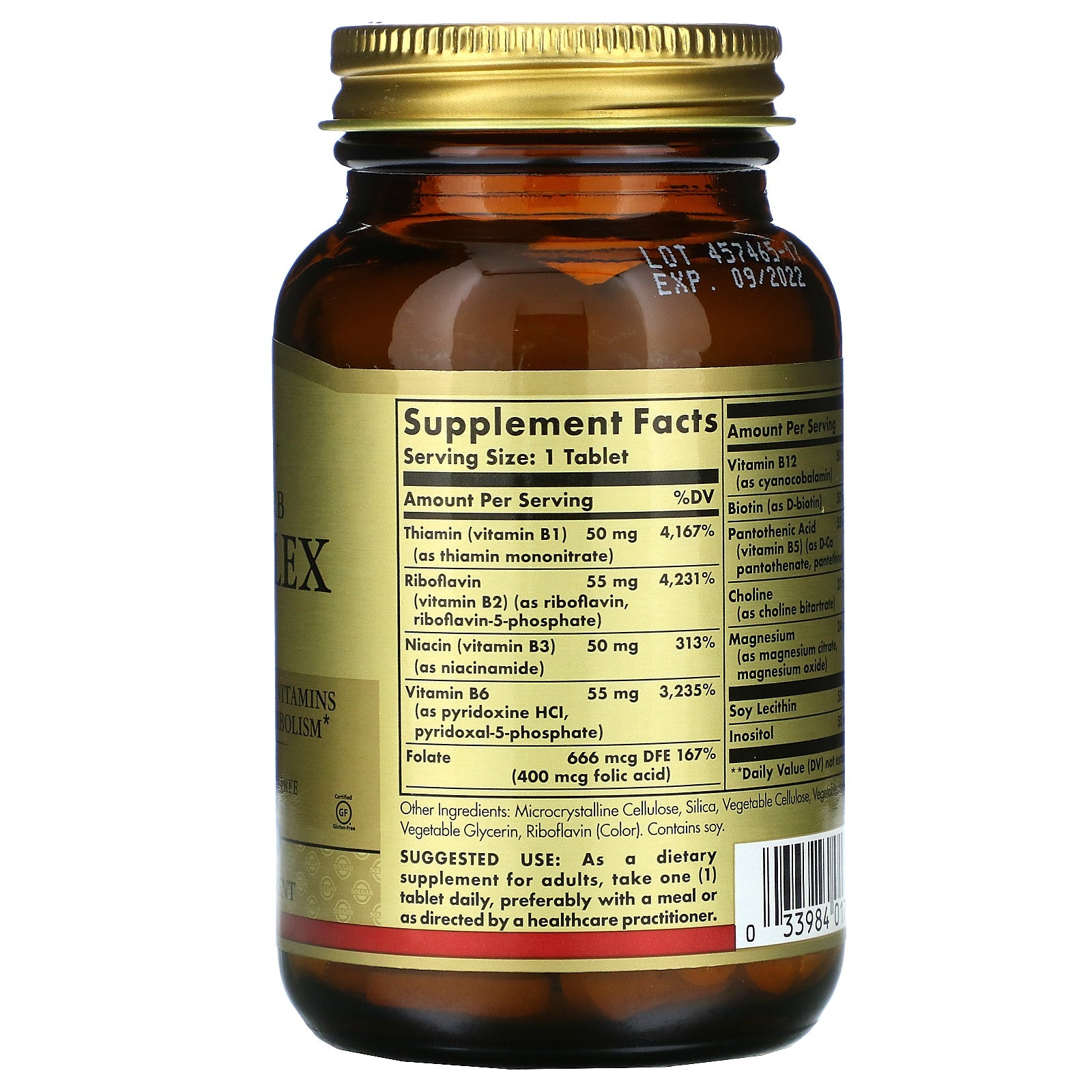Since 1947 Contains Coenzyme B Vitamins Supports Energy Metabolism Non-GMO Wheat & Dairy Free Suitable For Vegans Certified Gluten-Free Dietary Supplement B Complex vitamins are needed for the metabolism of carbohydrates, fats and proteins, which converts food into energy.Sugg. UseAs a dietary supplement for adults, take one (1) tablet daily, preferably with a meal or as directed by a healthcare practitioner.Other IngredientsMicrocrystalline cellulose, silica, vegetable cellulose, vegetable magnesium stearate, vegetable glycerin, riboflavin (color). Contains Soy. Free of: Gluten, wheat, dairy, yeast, sugar, sodium, artificial flavor, and preservatives.Supplement FactsServing Size: 1 Tablet Amount Per Serving %Daily Value Thiamin (vitamin B1) (as thiamin mononitrate) 50 mg 4,167% Riboflavin (vitamin B2) (as riboflavin, riboflavin-5-phosphate) 55 mg 4,231% Niacin (vitamin B3) (as niacinamide) 50 mg 313% Vitamin B6 (as pyridoxine HCI, pyridoxal-5-phosphate) 55 mg 3,235% Folate 666 mcg DFE (400 mcg folic acid) 167% Vitamin B12 (as cyanocobalamin) 50 mcg 2,083% Biotin (as D-biotin)...