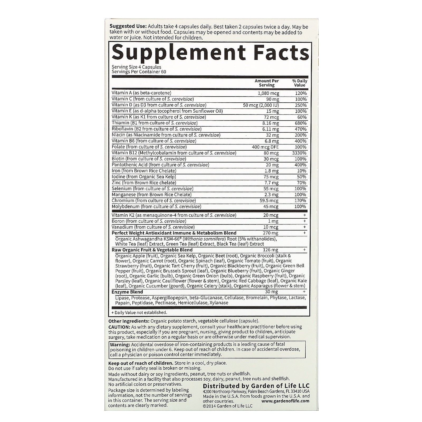 Serving Size: 4 Capsules Servings Per Container: 60 Amount Per Serving % Daily Value Vitamin A (as beta-carotene) 1,080 mcg 120% Vitamin C (from culture of S. cerevisiae) 90 mg 100% Vitamin D (as D3 from culture of S. cerevisiae) 50 mcg (2,000 IU) 250% Vitamin E (as d-alpha tocopherol from Sunflower Oil) 15 mg 100% Vitamin K (as K1 from culture of S. cerevisiae) 72 mcg 60% Thiamin (B1 from culture of S. cerevisiae) 8.16 mg 680% Riboflavin (B2 from culture of S. cerevisiae) 6.11 mg 470% Niacin (as Niacinamide from culture of S. cerevisiae) 32 mg 200% Vitamin B6 (from culture of S. cerevisiae) 6.8 mg 400% Folate (from culture of S. cerevisiae) 400 mcg DFE 100% Vitamin B12 (Methylcobalamin from culture of S. cerevisiae) 80 mcg 3330% Biotin (from culture of S. cerevisiae) 30 mcg 100% Pantothenic Acid (from culture of S. cerevisiae) 20 mg 400% Iron (from Brown Rice Chelate) 1.8 mg 10% Iodine (from Organic Sea Kelp) 75 mcg 50% Zinc (from Brown Rice chelate) 7.7 mg 70% Selenium (from culture of S. cerevisiae) 55 mcg 100% Manganese (from Brown Rice Chelate) 2.3 mg 100% Chromium (from culture of S. cerevisiae) 59.5 mcg 170% Molybdenum (from culture of S. cerevisiae) 45 mcg 100% Vitamin K2 (as menaquinone-4 from culture of S. cerevisiae) 20 mcg + Boron (from culture of S. cerevisiae) 1 mg + Vanadium (from culture of S. cerevisiae) 10 mcg + Perfect Weight Antioxidant Immune & Metabolism Blend Organic Ashwagandha KSM-66® (Withania somnifera) Root (5% withanolides), White Tea (leaf) Extract, Green Tea (leaf) Extract, Black Tea (leaf) Extract 270 mg + Raw Organic Fruit & Vegetable Blend Organic Apple (fruit), Organic Sea Kelp, Organic Beet (root), Organic Broccoli (stalk & flower), Organic Carrot (root), Organic Spinach (leaf), Organic Tomato (fruit), Organic Strawberry (fruit), Organic Tart Cherry (fruit), Organic Blackberry (fruit), Organic Green Bell Pepper (fruit), Organic Brussels Sprout (leaf), Organic Blueberry (fruit), Organic Ginger (root), Organic Garlic (bulb), Organic Green Onion (bulb), Organic Raspberry (fruit), Organic Parsley (leaf), Organic Cauliflower (flower & stem), Organic Red Cabbage (leaf), Organic Kale (leaf), Organic Cucumber (gourd), Organic Celery (stalk), Organic Asparagus (flower & stem) 126 mg + Enzyme Blend Lipase, Protease, Aspergillopepsin, beta-Glucanase, Cellulase, Bromelain, Phytase, Lactase, Papain, Peptidase, Pectinase, Hemicellulase, Xylanase 30 mg + + Daily Value not established.Disclaimer