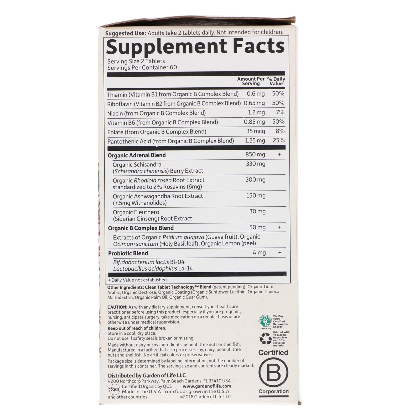 Serving Size : 2 Tablets Serving Per Container : 60 Amount Per Serving % Daily Value Thiamin (Vitamin B1 from B Complex Blend) 0.6 mg 50% Riboflavin (Vitamin B2 from B Complex Blend) 0.65 mg 50% Niacin (from B Complex Blend) 1.2 mg 7% Vitamin B6 (from B Complex Blend) 0.85 mg 50% Folate (from B Complex Blend) 35 mcg 8% Pantothenic Acid (from B Complex Blend) 1.25 mg 25% Adrenal Blend 850 mg + Schisandra (Schisandra chinensis) Berry Extract 330 mg Rhodiola rosea Root Extract standardized to 2% Rosavins (6 mg) 300 mg Ashwagandha Root Extract (7.5 mg Withanolides) 150 mg Eleuthero (Siberian Ginseng) Root Extract 70 mg B Complex Blend 50 mg + Extracts of Psidium guajava (Guava fruit), Ocimum sanctum (Holy Basil leaf), Lemon (peel) Probiotic Blend 4 mg + Bifidobacterium lactis Bl-04 Lactobacillus acidophilus La-14 + Daily Value not established.Disclaimer