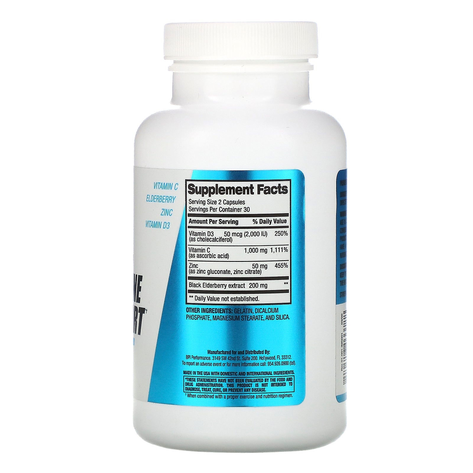 Immune Support† Gluten Free Non-GMO Dietary Supplement Vitamin C, Elderberry, Zinc, Vitamin D3 No Artificial Flavors/Colors No Chemical Preserves †When combined with a proper exercise and nutrition regimen.Sugg. UsePlease read entire label before use. Take two (2) capsules daily, or as directed by a qualified healthcare practitioner.Other IngredientsGelatin, dicalcium phosphate, magnesium stearate, and silica.Supplement FactsServing Size: 2 Capsules Serving Per Container: 30 Amount Per Serving %Daily Value Vitamin D (as cholecalciferol) 50 mcg (2,000 IU) 250% Vitamin C (as ascorbic acid) 1,000 mg 1,111% Zinc (as zinc gluconate, zinc citrate) 50 mg 455% Black Elderberry extract 200 mg ** ** Daily Value not established.DisclaimerWhile VitaminsUK strives to ensure the accuracy of its product images and information, some manufacturing changes to packaging and/or ingredients may be pending update on our site. Although items may occasionally ship with alternate packaging, freshness is always guaranteed. We recommend that you read labels, warnings and...