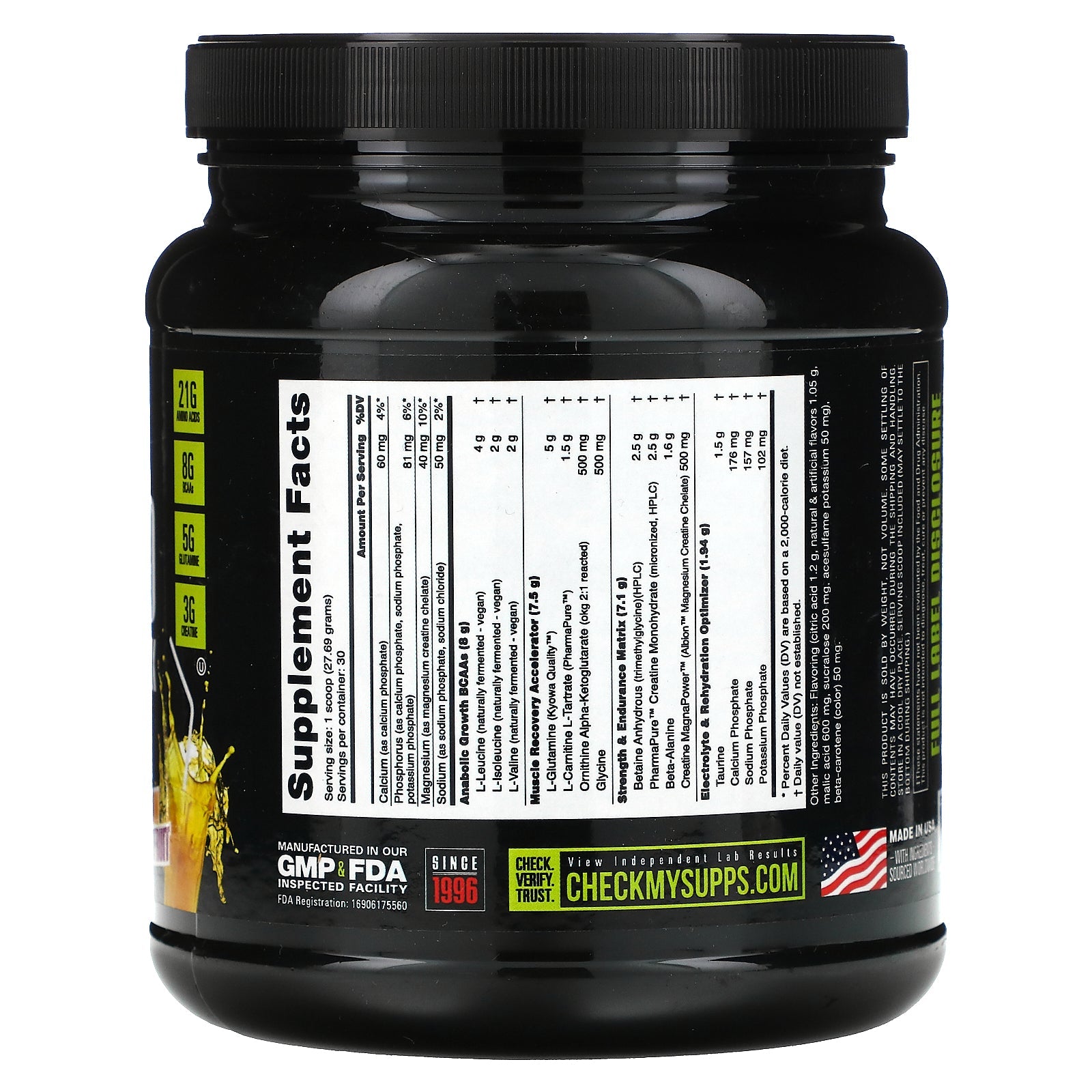 Serving Size: 1 Scoop (27.69 grams) Serving Per Container: 30 Amount Per Serving %Daily Value Calcium (as calcium phosphate) 60 mg 4%* Phosphorus (as calcium phosphate, sodium phosphate, potassium phosphate) 81 mg 6%* Magnesium (as magnesium creatine chelate) 40 mg 10%* Sodium (as sodium phosphate, sodium chloride) 50 mg 2%* Anabolic Growth BCAAs L-Leucine (naturally fermented - vegan) L-Isoleucine (naturally fermented - vegan) L-Valine (naturally fermented - vegan) (8 g) 4 g 2 g 2 g † † † Muscle Recovery Accelerator L-Glutamine (Kyowa Quality™) L-Carnitine L-Tartrate (PharmaPure™) Ornithine Alpha-Ketoglutarate (okg 2:1 reacted) Glycine (7.5 g) 5 g 1.5 g 500 mg 500 mg † † † † Strength & Endurance Matrix Betaine Anhydrous (trimethylglycine) (HPLC) PharmaPure™ Creatine Monohydrate (micronized, HPLC) Beta-Alanine Creatine MagnaPower® (Albion™ Magnesium Creatine Chelate) (7.1 g) 2.5 g 2.5 g 1.6 g 500 mg † † † † Electrolyte & Rehydration Optimizer Taurine Calcium Phosphate Sodium Phosphate Potassium Phosphate (1.94 g) 1.5 g 176 mg 157 mg 102 mg † † † † *Percent Daily Values (DV) are based on a 2,000 calorie diet. †Daily Value (DV) not established.Disclaimer
