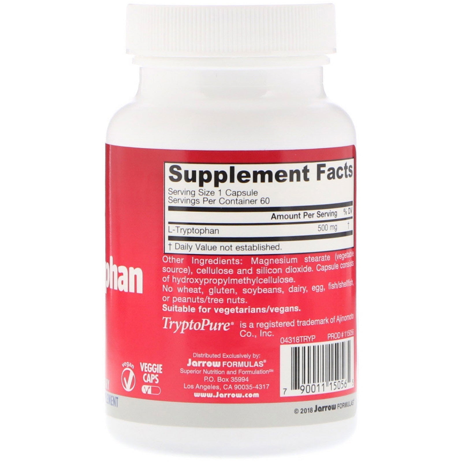 For Relaxation, Positive Mood & Sleep Vegan Veggie Caps Dietary Supplement TryptoPure Suitable for Vegetarians/Vegans L-Tryptophan is an essential amino acid and hence cannot be synthesized by the body, but must be obtained from food or supplements. Because L-tryptophan is converted to serotonin (5-hydroxytryptamine) and melatonin in the body, it plays an important role in promoting relaxation, restful sleep and positive mood. L-tryptophan may also help in reducing carbohydrate cravings. Jarrow Formulas L-Tryptophan TryptoPure is manufactured at a GMP facility via fermentation from vegetable materials.Sugg. UseTake 1 capsule on an empty stomach 30 minutes before sleep with water or fruit juice or as directed by your qualified healthcare professional.Other IngredientsMagnesium stearate (vegetable source), cellulose and silicon dioxide. Capsule consists of hydroxypropylmethylcellulose. No wheat, gluten, soybeans, dairy, egg, fish/shellfish, peanuts/tree nuts.Supplement FactsServing Size: 1 Capsule Servings Per Container: 60 Amount Per Serving % DV L-Tryptophan 500 mg † † Daily Value...