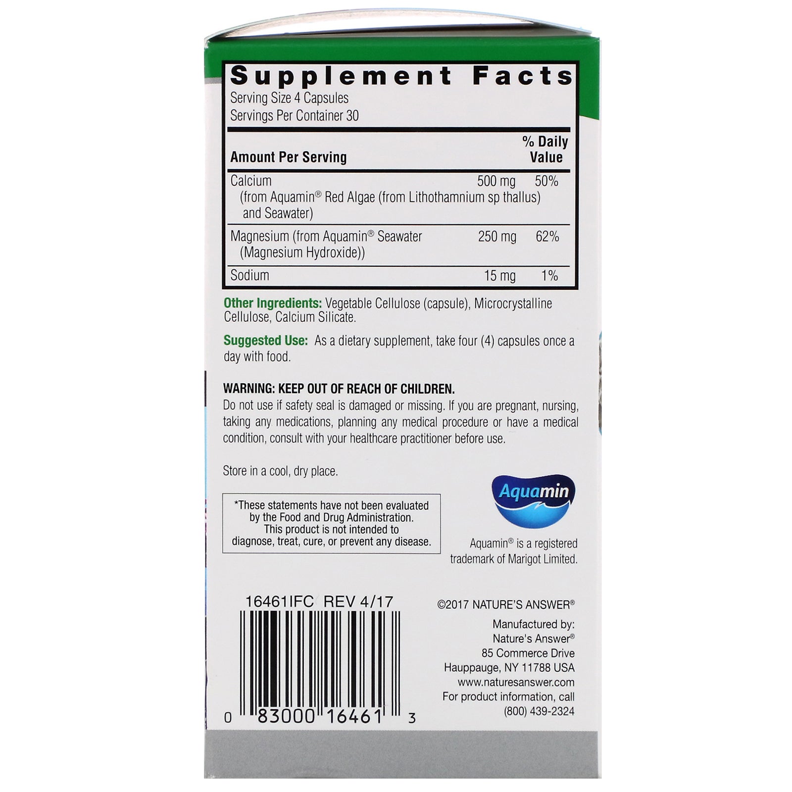 Serving Size: 4 Capsules Servings Per Container: 30 Amount Per Serving %Daily Value Calcium (from Aquamin® Red Algae (from Lithothamnium sp thallus) and Seawater) 500 mg 50% Magnesium (from Aquamin® Seawater (Magnesium Hydroxide)) 250 mg 62% Sodium 15 mg 1%Disclaimer