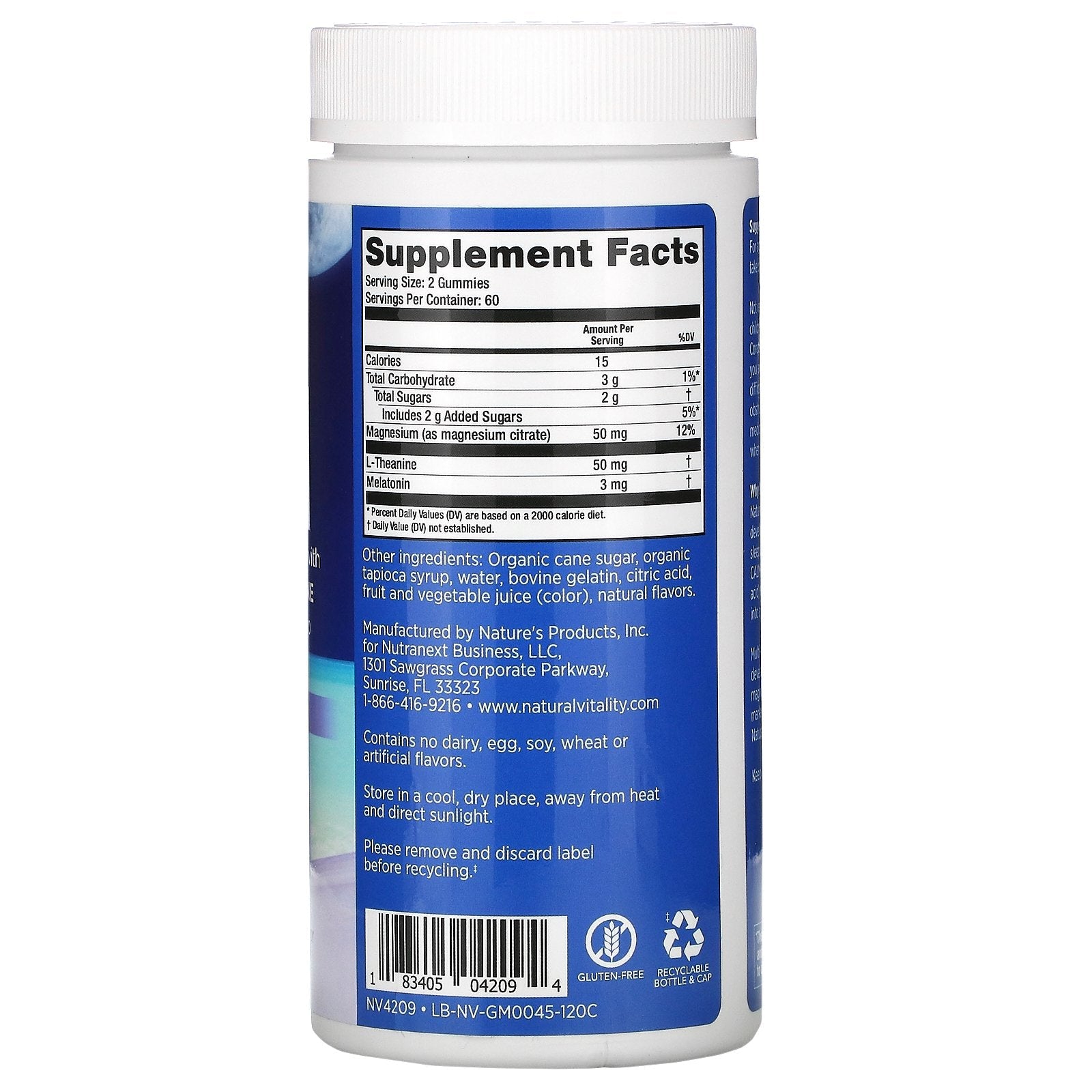 A Magnesium Supplement with Melatonin - L-Theanine For a Good Night's Sleep With Other Natural Flavors Dietary Supplement Gluten-Free Why Natural Vitality CALM ® Sleep Gummies? Natural Vitality CALM ® Sleep Gummies were developed specifically for those times we need sleep support. They feature Natural Vitality CALM ® along with L-Theanine (a relaxing amino acid) and melatonin, which helps the body ease into a restful sleep. Multi-award-winning Natural Vitality CALM ® , developed by Peter Gillham, is the best-selling magnesium supplement in the natural products market. (December 2019 Volume sales data for Natural Products market as defined by SPINS).Sugg. UseFor ages 13 years and older: Before bedtime, take one serving (two gummies).Other IngredientsOrganic cane sugar, organic tapioca syrup, water, bovine gelatin, citric acid, fruit and vegetable juice (color), natural flavors. Contains no dairy, egg, soy, wheat or artificial flavors.Supplement FactsServing Size: 2 Gummies Serving Per Container: 60 Amount Per Serving...