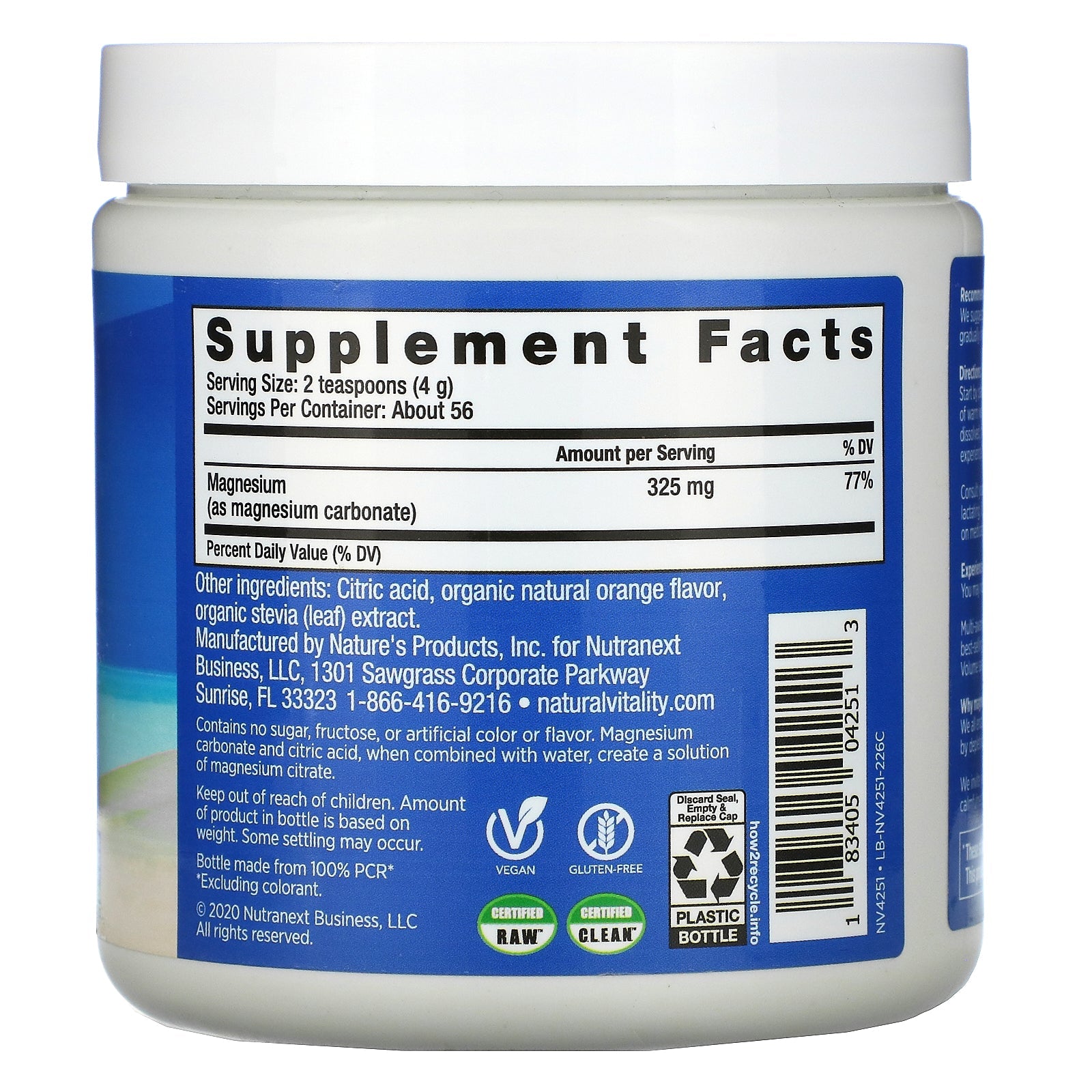 A Magnesium Supplement NON GMO Project Verified Vegan Gluten-Free Certified R.A.W.™ Certified C.L.E.A.N. ™ Experience CALM: You may notice muscles relaxing and an overarching sense of calmfulness. Multi-award-winning Natural Vitality CALM®, developed by Peter Gillham, is the best-selling magnesium supplement in the natural products market. (January 2020 Volume sales data for Natural Products market as defined by SPINS). Why Magnesium? We all encounter stress daily whether we realize it or not, and our bodies can respond by depleting our magnesium levels. We invite you to help replenish your body's magnesium levels and enjoy the wave of calmfulness.Sugg. UseRecommended Use for Adults: We suggest starting out with half a teaspoon (1 g) of Natural Vitality CALM® powder, gradually increasing to two teaspoons (4 g) daily. Start by placing your desired amount of powder into a cup or mug, add 2-3 ounces of warm water, and let your drink fizz. Stir the...