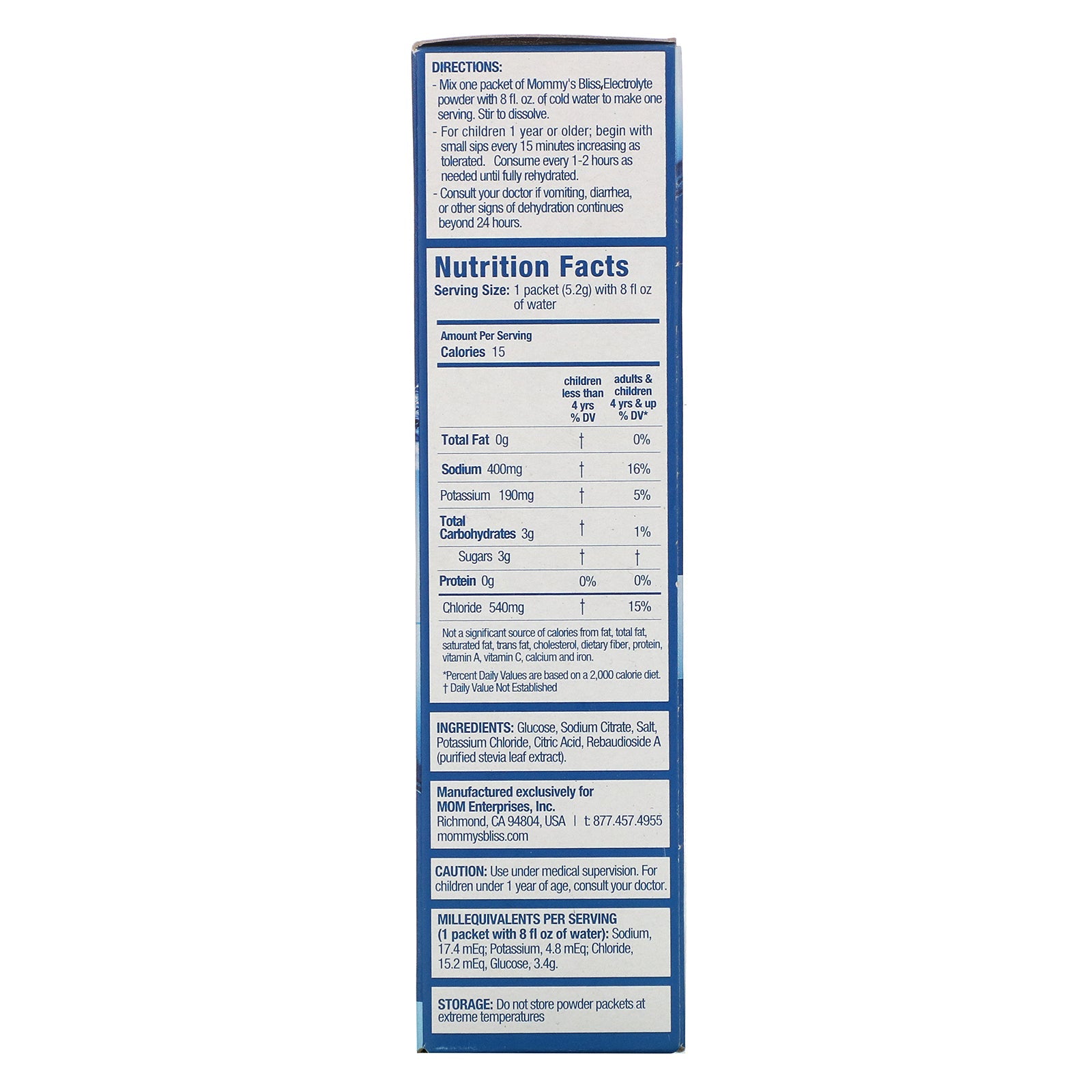 Glucose, sodium citrate, salt, potassium chloride, citric acid, rebaudioside A (purified stevia leaf extract). Millequivalents per serving (1 packet with 8 fl oz of water): sodium, 17.4 mEq; potassium, 4.8 mEq; chloride, 15.2 mEq, glucose, 3.4 g. One Serving of Mommy's Bliss Electrolyte Powder Provides: sodium, 17.4 mEq; potassium, 4.8 mEq; chloride, 15.2 mEq; glucose, 3.4 g.Supplement Facts