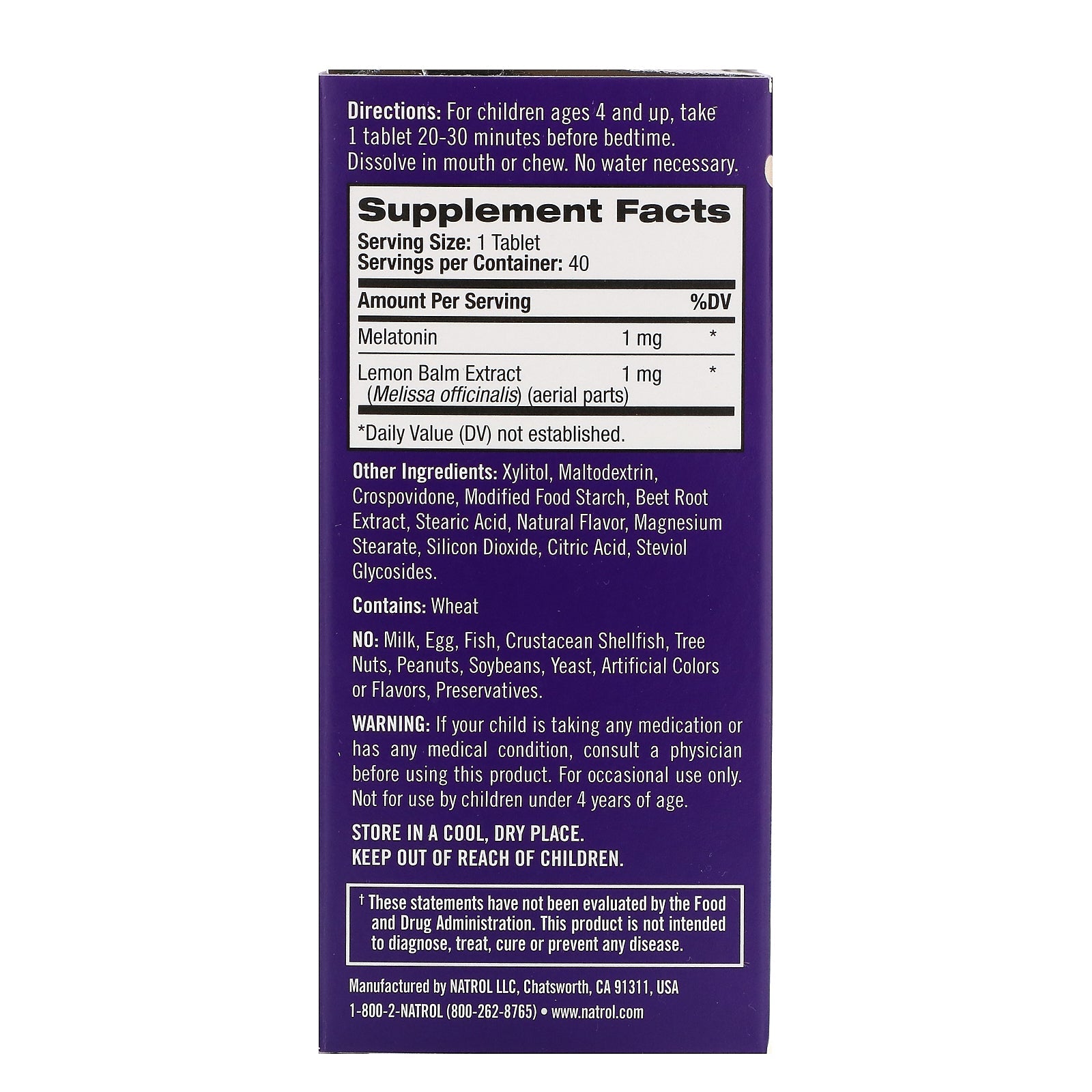 Serving Size: 1 Tablet Serving Per Container: 40 Amount Per Serving %Daily Value Melatonin 1 mg * Lemon Balm Extract (Melissa officinalis)(aerial parts) 1 mg * Daily Value not established.Disclaimer