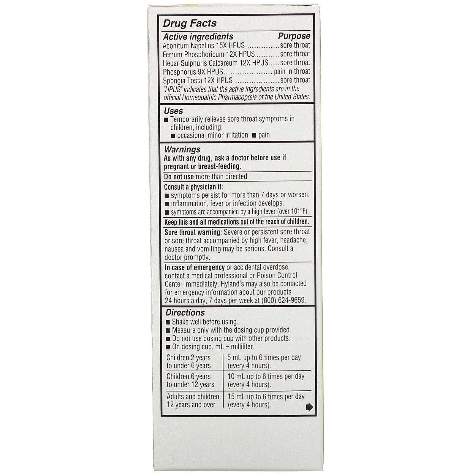 Homeopathic Since 1903 Relieves Minor Sore Throat Pain and Irritation No Alcohol or Parabens No Sugar or Dyes Natural Relief Safe & Gentle Natural Active Ingredients No Side Effects Uses: Temporarily relieves sore throat symptoms in children, including. Occasional minor irritation Pain Parenting is tough. We make it easier. For more than 115 years, Hyland's has worked every day to provide families with comfort and care. So your kids - and you - feel better, faster. Hyland's 4 Kids Sore Throat provides temporary relief of sore throat symptoms in children including pain and irritation.Sugg. UseShake well before using. Measure only with the dosing cup provided. Do not use dosing cup with other products. On dosing cup, mL=milliliter. Children 2 years to under 6 years 5 ml up to 6 times per day (every 4 hours) Children 6 years to under 12 years 10 ml up to 6 times per day...