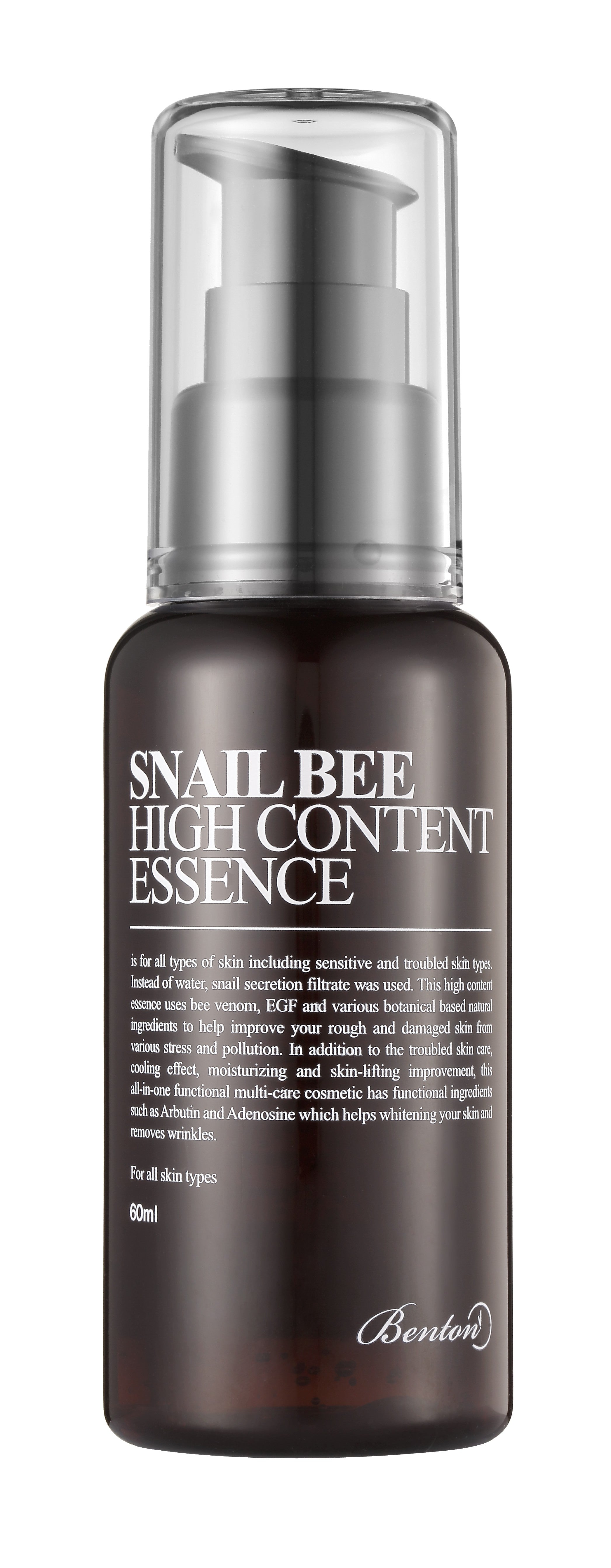 This essence helps keep your skin hydrated and smooth and improves your complexion. Use: It features anti-aging and brightening effects. Content/Format (ml/gr): 60ml / 2.02 fl. oz. Skin type: All skin types Key Ingredients: Snail secretion filtrate, bee venom Ingredients: Aqua (Water), Snail Secretion Filtrate, Butylene Glycol, Glycerin, Niacinamide, 1,2-Hexanediol, Aloe Barbadensis Leaf Juice, sh-Oligopeptide-1, Bee Venom, Plantago Asiatica Extract, Laminaria Digitata Extract, Diospyros Kaki Leaf Extract, Salix Alba (Willow) Bark Extract, Ulmus Campestris (Elm) Extract, Althaea Rosea Root Extract, Aloe Barbadensis Leaf Extract, Beta-Glucan, Betaine, Acrylates/C10-30 Alkyl Acrylate Crosspolymer, Adenosine, Panthenol, Allantoin, Pentylene Glycol, Zanthoxylum Piperitum Fruit Extract, Pulsatilla Koreana Extract, Usnea Barbata (Lichen) Extract, Polysorbate 20, Lecithin, Arginine. How to use: After cleansing and toning, pump once or twice onto a cotton round or directly into your palms. Gently press the product into your face and neck for deep hydration. Routine step: 6. Essence