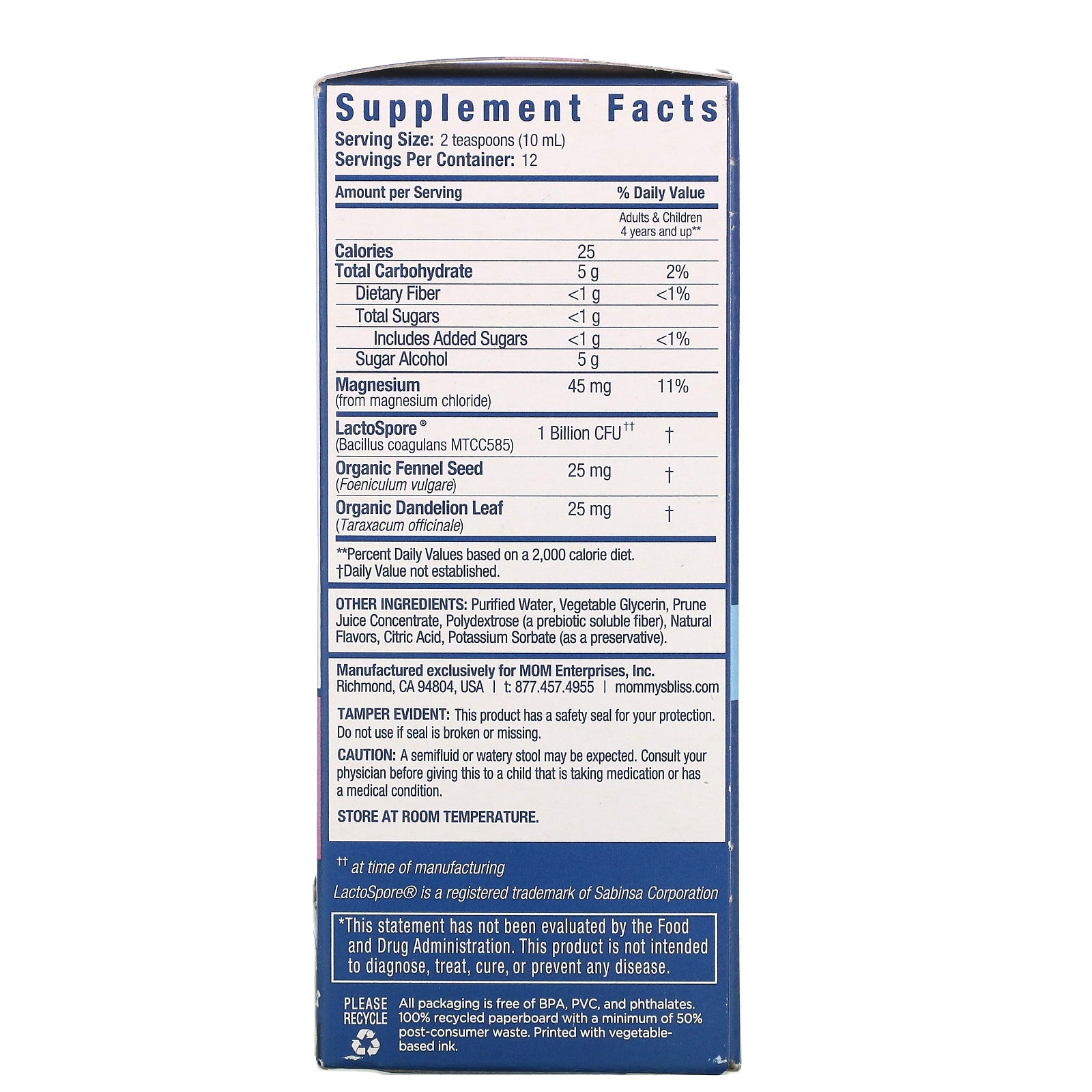 Agitar bien. El sedimento es normal. Dispense la cantidad de porción recomendada en la taza medidora suministrada. Enjuague después de su uso. Puede tomarse hasta 2 veces al día hasta que las deposiciones sean regulares o mejoren. Desechar 6 semanas después de la apertura. Porción recomendada: 6 meses - 3 años: No recomendado 4 años en adelante: 2 cucharaditas (10 ml) Otros ingredientes