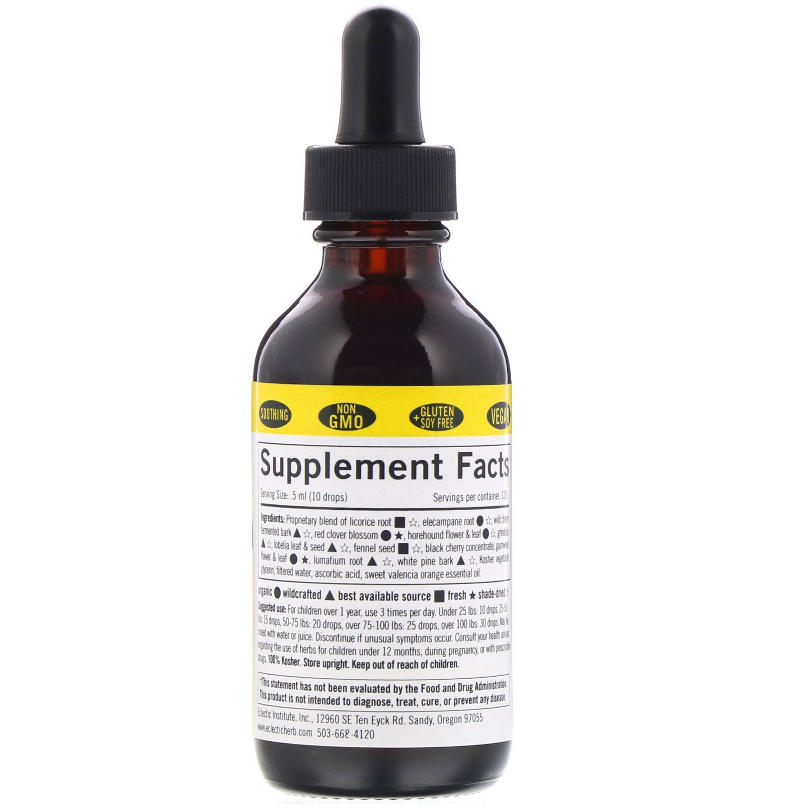 Desde 1982 Suplemento dietético Calmante Sin OGM Sin gluten + Sin soja Vegano 100% kosher Sugerir. Usar Para niños mayores de 1 año, utilizar 3 veces al día. Menos de 25 libras: 10 gotas, 25-50 libras: 15 gotas, 50-75 libras: 20 gotas, más de 75-100 libras: 25 gotas, más de 100 libras: 30 gotas. Se puede mezclar con agua o jugo. Otros ingredientes Hechos suplementarios Tamaño de la porción: 0,5 ml (10 gotas) Porción por envase: 120 Ingredientes: Mezcla patentada de raíz de regaliz ■ ◊, raíz de helenio •◊, corteza fermentada de cerezo silvestre ▲ ◊, flor de trébol rojo • ♦, flor y hoja de marrubio • ◊, flor y hoja de grindelia •♦, raíz de lomatium ▲ ◊, corteza de pino blanco ▲ ◊, glicerina vegetal kosher, agua filtrada, ácido ascórbico, aceite esencial de naranja valencia dulce. Orgánico • elaborado de forma silvestre ▲ la mejor fuente...