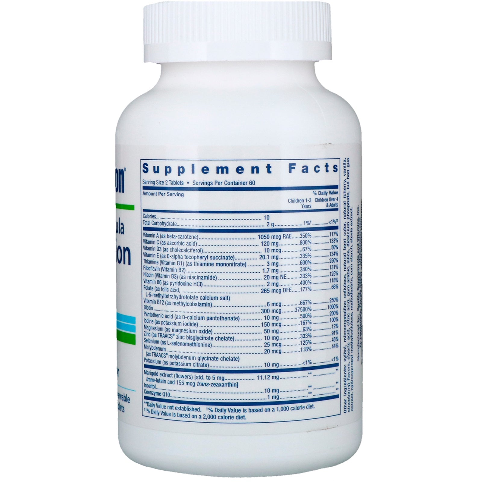 Tamaño de la porción: 2 tabletas Porciones por envase: 60 Cantidad por porción % Valor diario Niños 1-3 años % Valor diario Niños mayores de 4 años y adultos Calorías 10 Carbohidratos totales 2 g 1%† <1%†† Vitamina A (como betacaroteno ) 1050 mcg RAE 350% 117% Vitamina C (como ácido ascórbico) 120 mg 800% 133% Vitamina D3 (como colecalciferol) 10 mcg 67% 50% Vitamina E (como succinato de D-alfa tocoferilo) 20,1 mg 335% 134% Tiamina (Vitamina B1) (como mononitrato de tiamina) 3 mg 600 % 250 % Riboflavina (Vitamina B2) 1,7 mg 340 % 131 % Niacina (Vitamina B3) (como niacinamida) 20 mg NE 333 % 125 % Vitamina B6 (como piridoxina HCI) 2 mg 400% 118% Folato (como ácido fólico, sal cálcica de metiltetrahidrofolato L-5) 265 mcg DFE 177% 66% Vitamina B12 (como metilcobalamina) 6 mcg 667% 250% Biotina 300 mcg 37500% 1000% Ácido pantoténico (como D- pantotenato de calcio) 10 mg 500 % 200 % Yodo (como yoduro de potasio) 150 mcg 167 % 100 % Magnesio (como óxido de magnesio) 50 mg 63 % 12 % Zinc (como quelato de bisglicinato de zinc TRAACS®) 10 mg 333 % 91 % Selenio ( como L-selenometionina) 25 mcg 125% 45% Molibdeno (como quelato de glicinato de molibdeno TRAACS®) 20 mcg 118% 44% Potasio (como citrato de potasio) 10 mg <1% >1% Extracto de caléndula (flores) [estándar. a 5 mg 11.12 mg** **trans-luteína y 155 mcg trans-zeaxantina] Inositol 10 mg** **Coenzima Q10 1 mg** ** **Valor Diario no establecido. †% del valor diario se basa en una dieta de 1000 calorías. ††% del valor diario se basa en una dieta de 2000 calorías. Descargo de responsabilidad