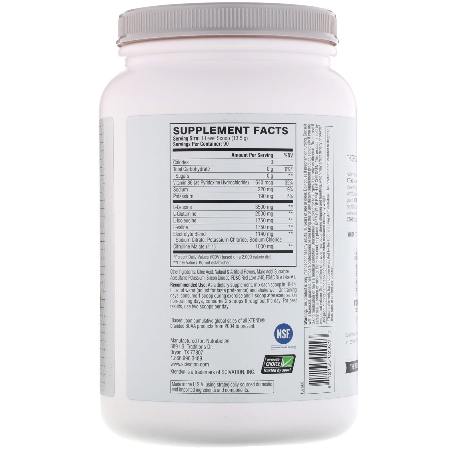 7 g de BCAA* Recuperación muscular + Electrolitos Con sabor natural y artificial 0 Calorías* 0 g Carbohidratos* 0 g Azúcar* 90 porciones Suplemento dietético NSF - Contenido probado y certificado Informed-Choice.Org - Confiado por el deporte La marca de BCAA número uno del mundo‡ La Marca oficial de recuperación de campeones. Una recuperación más rápida es la clave para obtener mejores resultados. Durante más de 10 años, Xtend fabrica los mejores productos de recuperación del mundo. Desarrollado por 7 gramos de aminoácidos de cadena ramificada (BCAA), que clínicamente se ha demostrado que apoyan la recuperación y el crecimiento muscular, Xtend Original también contiene electrolitos hidratantes e ingredientes de rendimiento adicionales para ayudarlo a repostar, repararse y recuperarse. Pruebe todos los deliciosos sabores sin azúcar de Xtend para respaldar sus objetivos de acondicionamiento físico. Cuándo tomar XTEND para obtener mejores resultados: Pre-entrenamiento - Xtend Energy Intra-entrenamiento - Xtend The Original Post-entrenamiento - Xtend Pro Combínelo con cualquier producto de la marca Xtend todos los días, incluso en los días de descanso, para ayudar a maximizar su recuperación. *Por porción ‡Basado en las ventas globales acumuladas de todos los productos BCAA de la marca Xtend desde 2004 hasta el presente.